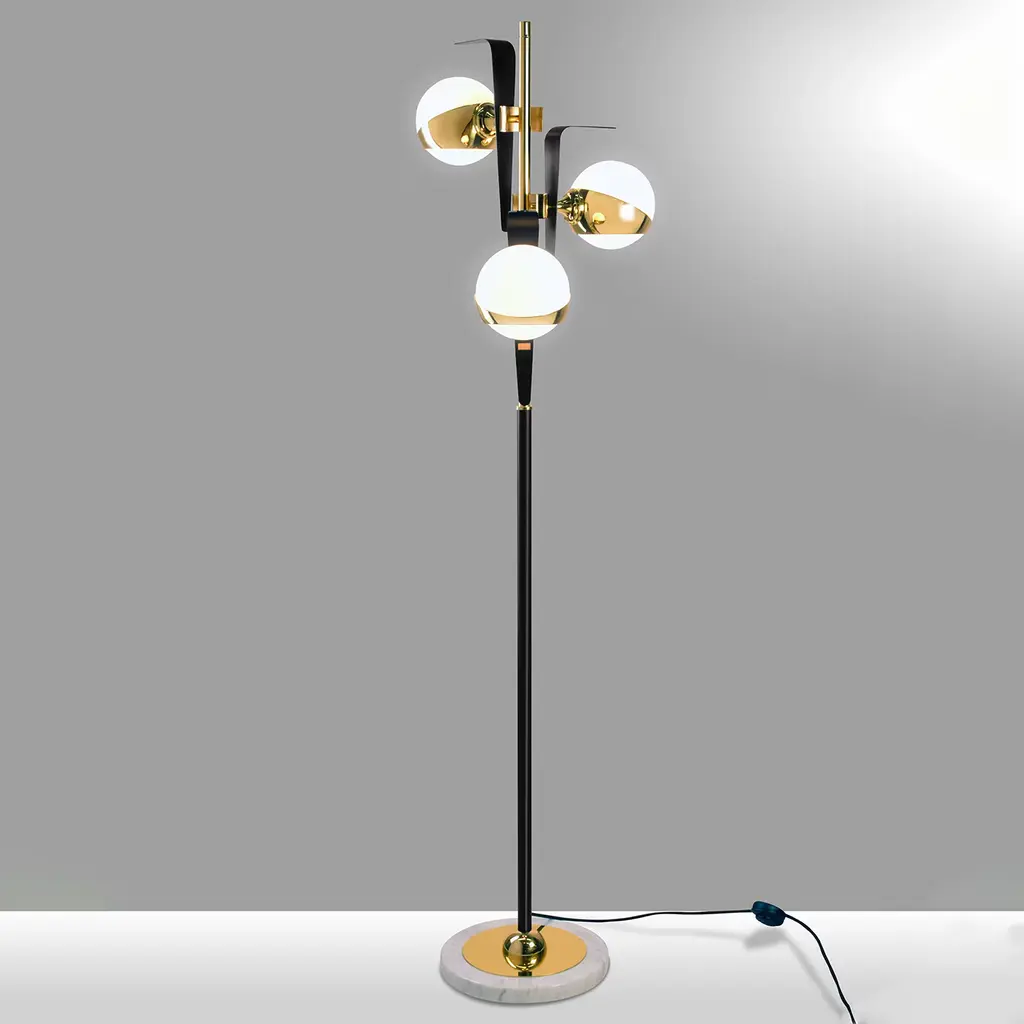 Incredibly sleek and refined in its linear design, this stupendous floor lamp will take center stage in a refined contemporary interior. Fashioned of black and gold-lacquered brass, it rests on a white marble base and features three stunningly luminous spherical shades. Please inquire with the Concierge for further details on materials.