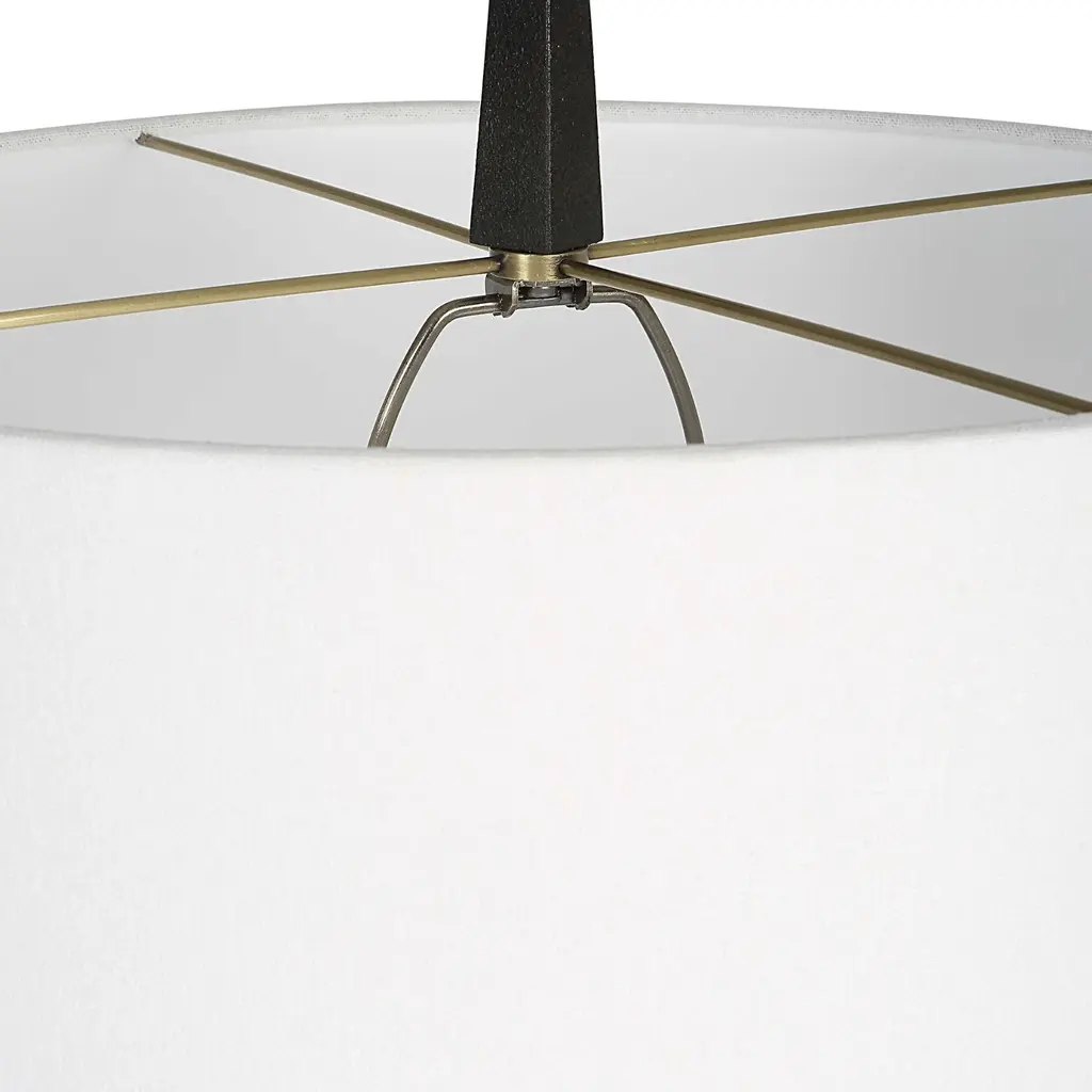 The Counteract floor lamp is influenced by traditional metalworking styles, including a tapered base and an industrial foot finished in aged black with subtle rust distressing. Complimented by a hardback drum shade made of white linen fabric.