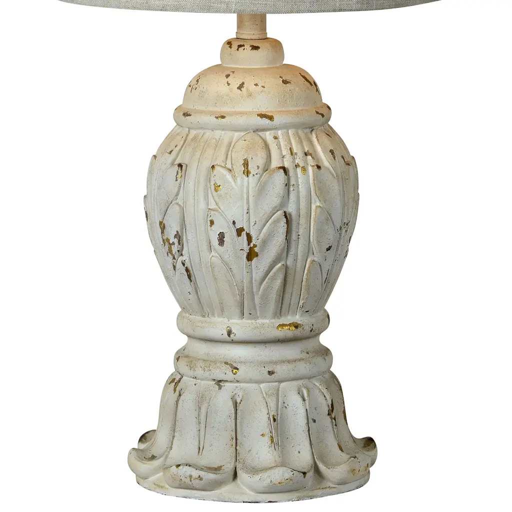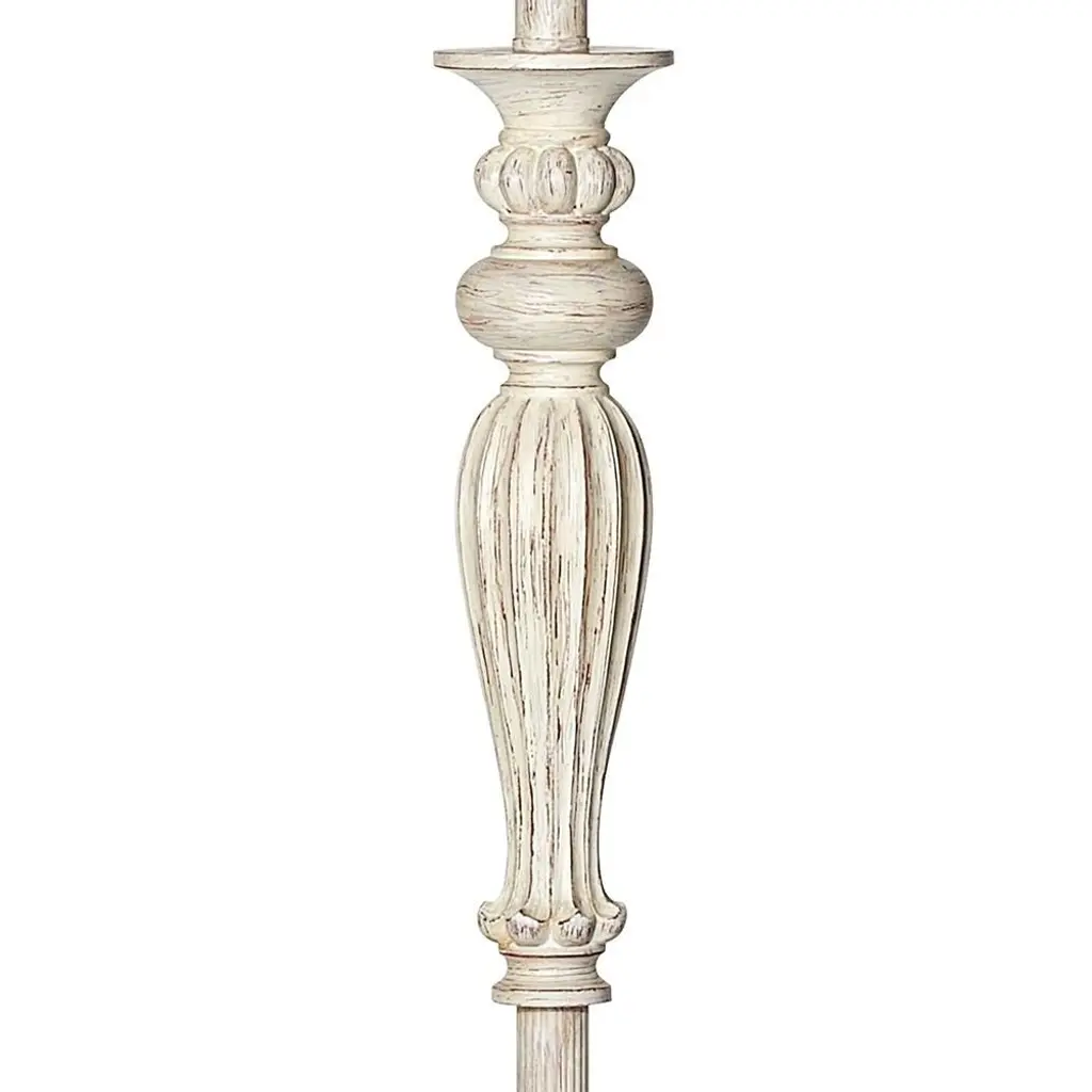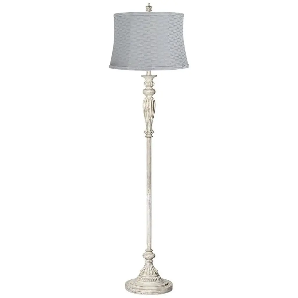 PRODUCT DETAILS: 60" high overall. Round base is 12" wide. Shade is 14" across the top x 16" across the bottom x 11" high. Weighs 9.9 lbs. Uses one maximum 150 watt standard-medium base bulb (not included). On-off rotary switch. Vintage look country cottage floor lamp. From the 360 Lighting brand. Antique white finish with burgundy undertones. Cast resin and metal construction. Basra gray softback drum shade. 8-foot long cord. DESCRIPTION: A rubbed white finish with burgundy undertones lends a sense of age and authenticity to this vintage country cottage floor lamp. It features a classic silhouette and cast resin and metal construction that shows exceptional attention to detail. The shade boasts a refined gray wave motif that create a subtle hint of energy and movement for any table lamp design. The shade includes a white lining for bright illumination and is complete with self-trim for a tailored look.