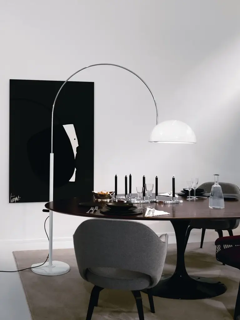 Joe Colombo and Oluce are a crucial and inseparable duo in the history of Italian design.Moved by the desire to remember Joe Colombo, who was prematurely torn from his research in 1971, Oluce, with the support of the Colombo archives, has for time been committed to the re-edition of a series of extraordinary lamps. These have been launched alongside other pieces that have continued in production like the famous Acrilica created in 1962, the Fresnel designed in 1966 and the 626 - the first halogenous lamp for domestic use - launched in 1970. Together these form a unique collection in terms of number and importance. The initiative began in 2002 with the re-launch of the 1965 Spider series, the winner of the 9th "Compasso d'Oro" design award and the re-edition of the 1968 Flash lamp and, of course, the beautiful Coupé series created in 1967.At the time, one of the most important pieces of the Coupé series was a sophisticated arched arm floor lamp. A few years on, Oluce has decided to complete this series after verifying its success among collectors and design passionates. The "arched" Coupé with its semi-spherical lamp head is indeed an "exceptional" lamp and is extremely complex to manufacture. In addition to the curved arm it has a grooved base with a special plastic handle to adjust the lamp head and the arched arm itself to different heights. The lamp head also, made of stove enamelled sheet metal, is fitted with a particular joint to adjust its inclination. The base is round but straight at the back, ideal for flush fitting against the wall.The "arched Coupé" therefore represents an element of space design that allows us to escape the "definitiveness" of a central light point. One of those design projects by Colombo that also had a significant influence on interior design. At this he was a master and other projects include enclosing an entire kitchen in a box (the Minikitchen in 1964) and rotating furniture (Combicenter in 1963 but also the Elda armchair in the same year). But most of all Colombo managed to dismantle many clichés of bourgeois lifestyle. We must not forget that today these pieces have become design icons due to their revolutionary influence already 40 year ago.Floor lamp giving direct light, metal lacquered base and structure, revolving and height adjustable chromium-plated arc, lacquered aluminium reflector.1 x max 100W - E27Structure: metalStructure color: chromium platedDiffuser/Reflector color: white, blackCertifications: CE