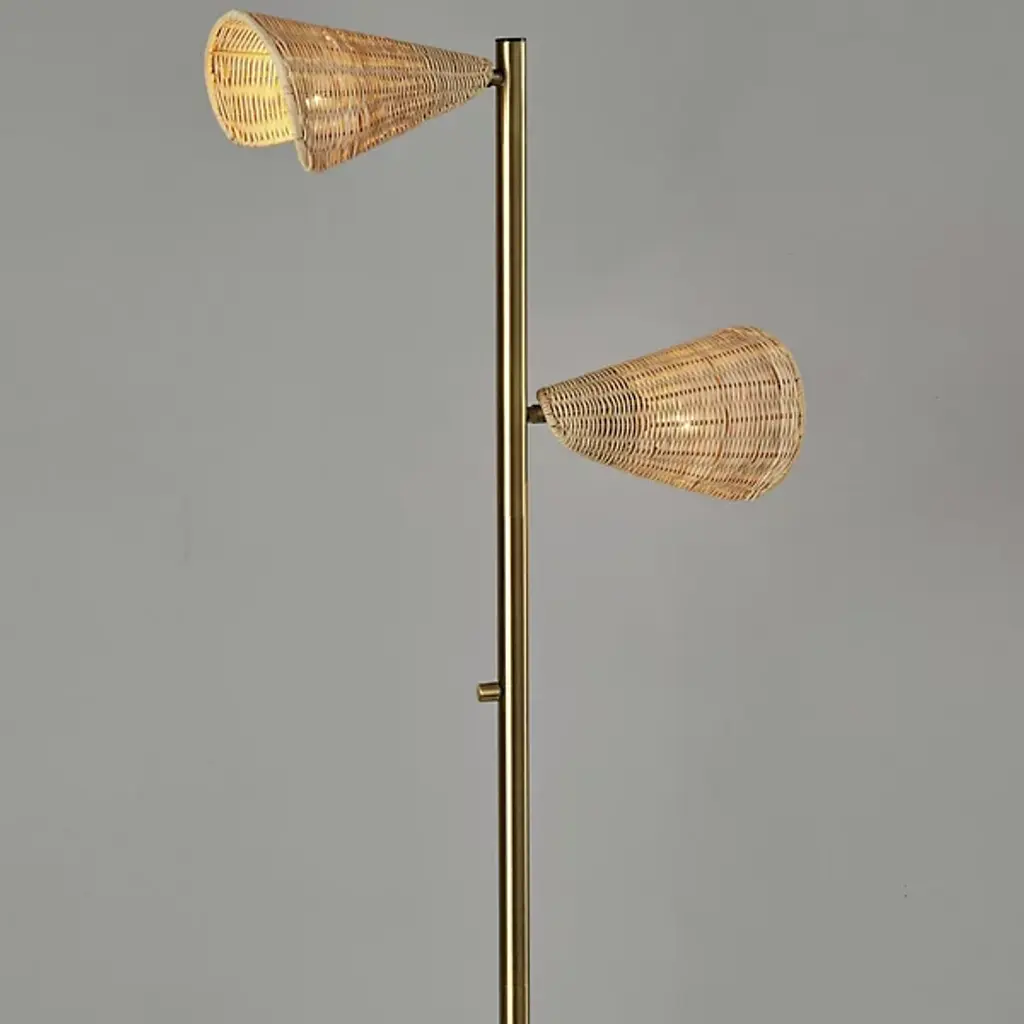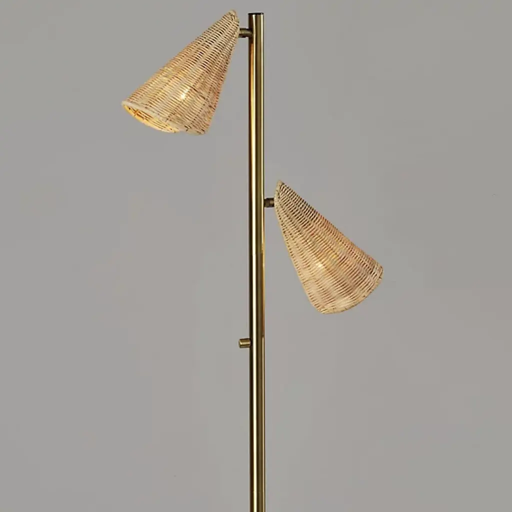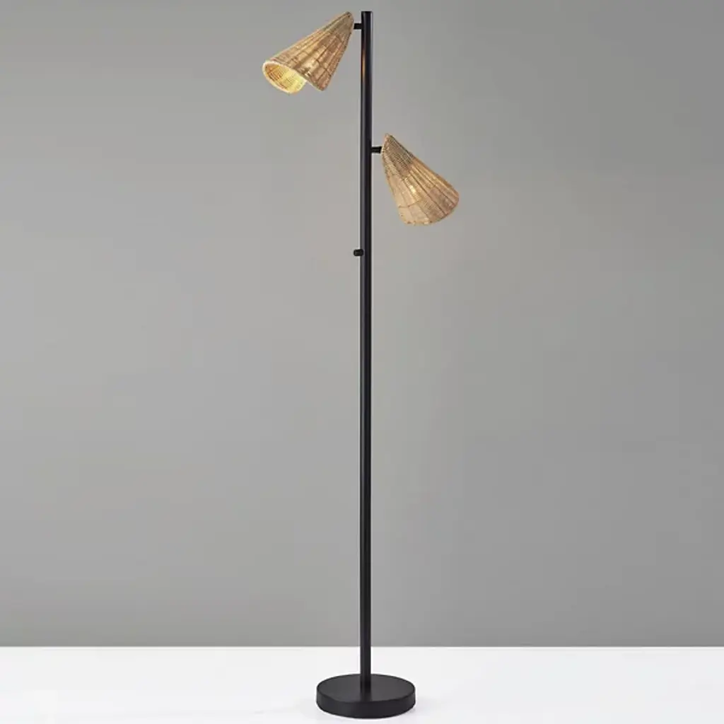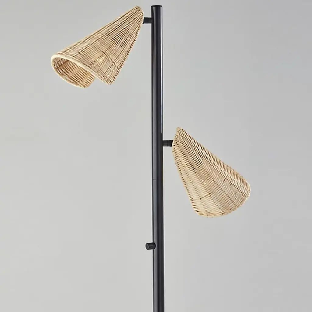 Featuring a blend of natural and contemporary elements and style lines, the Cove Tree Lamp by Adesso adds a distinctive look to your room. The round metal base and matching thin stem in clean lines complement contemporary or modern chic décor. The stem features two lights at staggered heights and directions, each with a hood-shaped shade fashioned of natural rattan material. The base of both shades includes an articulation point, allowing you to rotate the shades up or down and side to side to direct the light wherever it is needed.