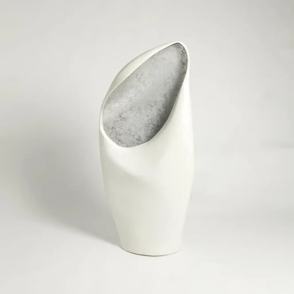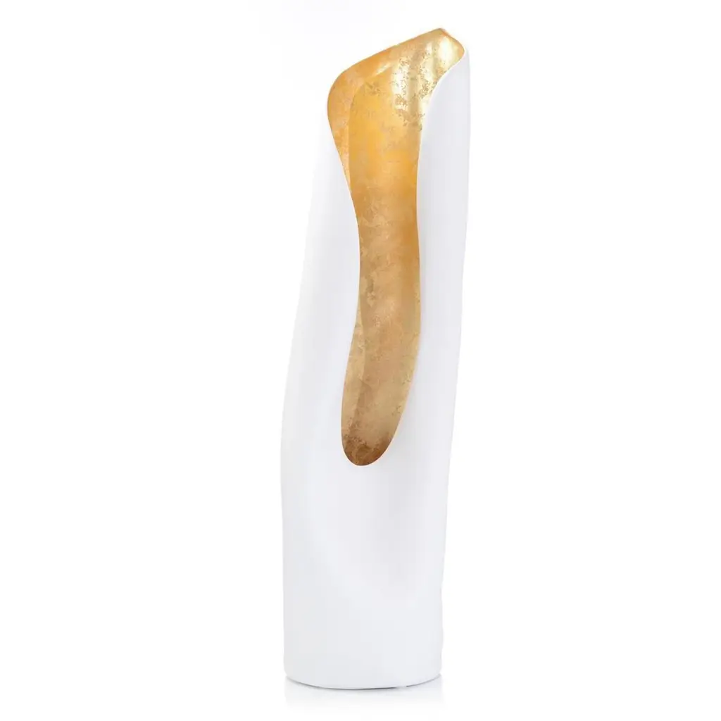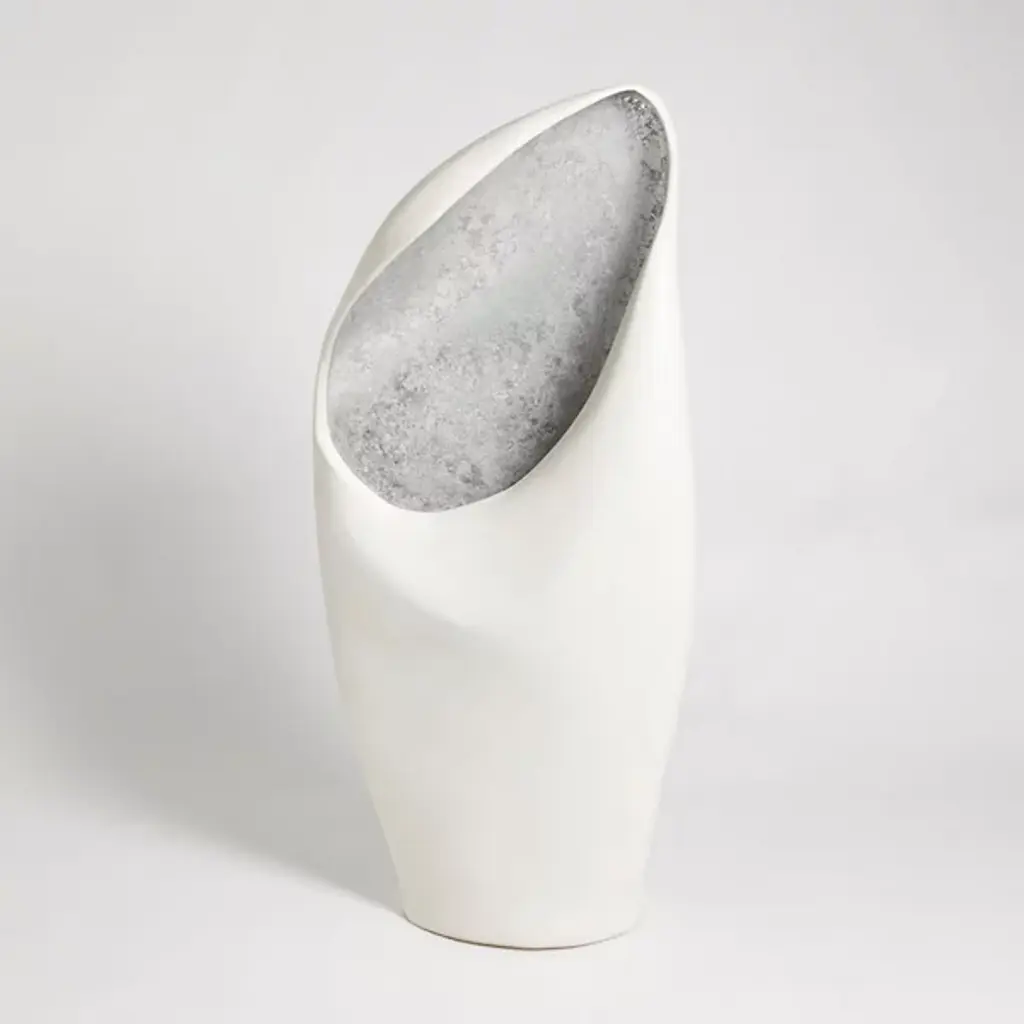 An abstract sculptural offering that seems to have transported in from an art gallery, the Cowl Floor Lamp from Global Views stands ready to enliven your living spaces. A large fixture made in Italy, its smooth ceramic body expands as it rises from the ground and sets its lamping securely inside a metallic interior. This remarkable texture offers a counterpoint to the sleek exterior, channeling light from the lamping upward through a roughly-surfaced diffuser set inside the body at an angle and bringing a pleasant warmth to its surroundings.