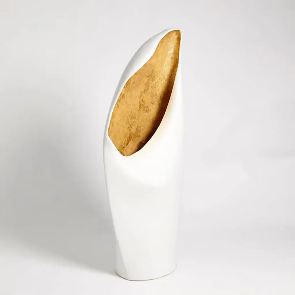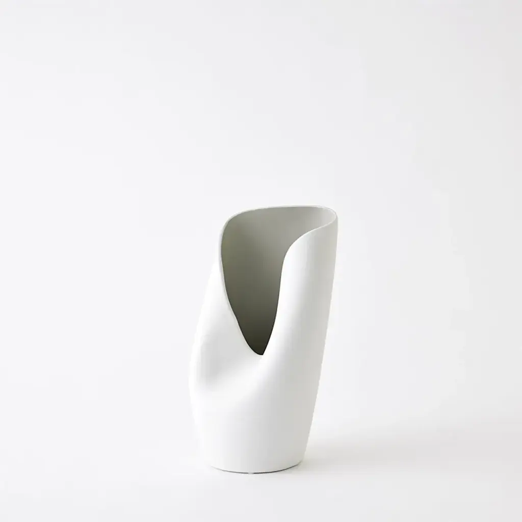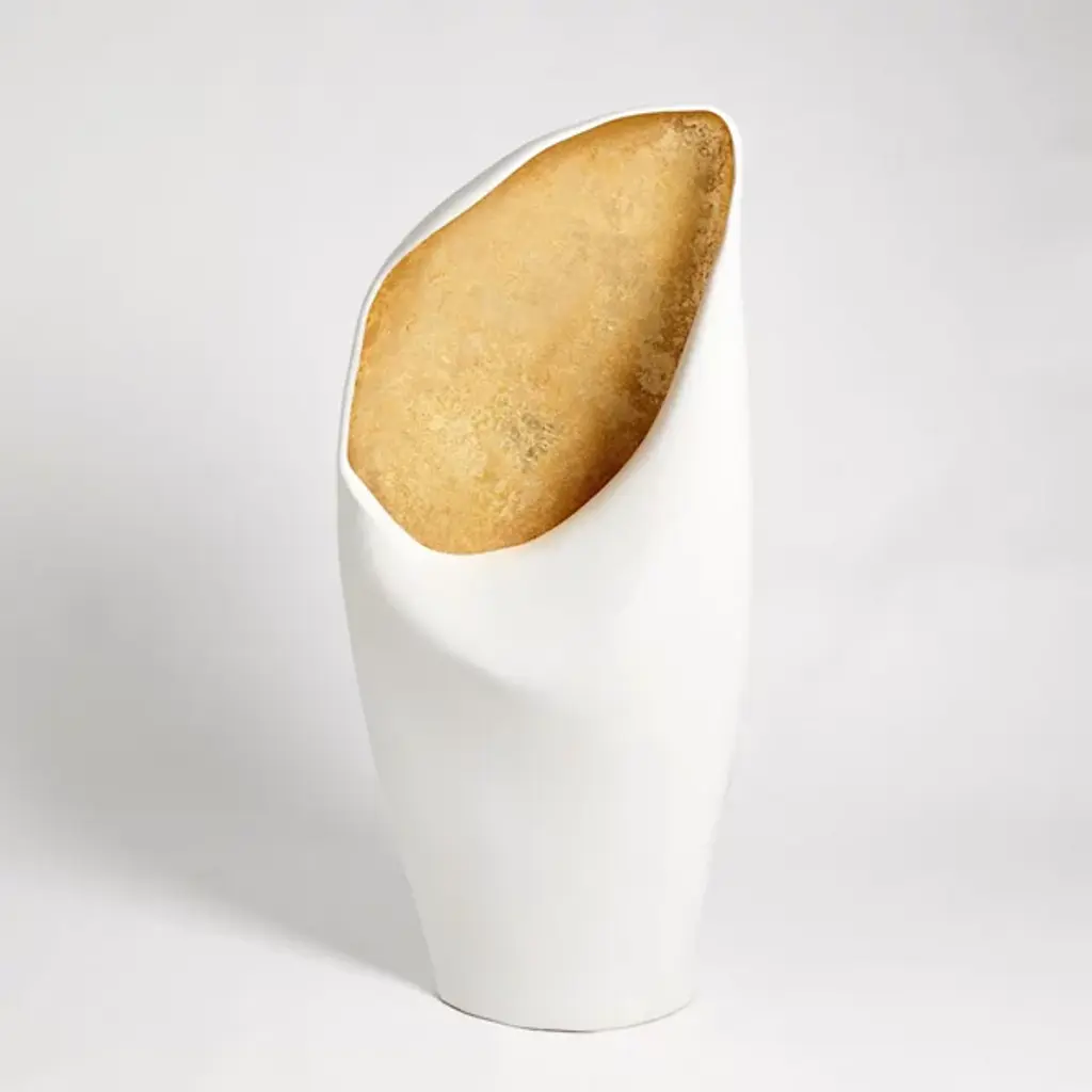 An abstract sculptural offering that seems to have transported in from an art gallery, the Cowl Floor Lamp from Global Views stands ready to enliven your living spaces. A large fixture made in Italy, its smooth ceramic body expands as it rises from the ground and sets its lamping securely inside a metallic interior. This remarkable texture offers a counterpoint to the sleek exterior, channeling light from the lamping upward through a roughly-surfaced diffuser set inside the body at an angle and bringing a pleasant warmth to its surroundings.