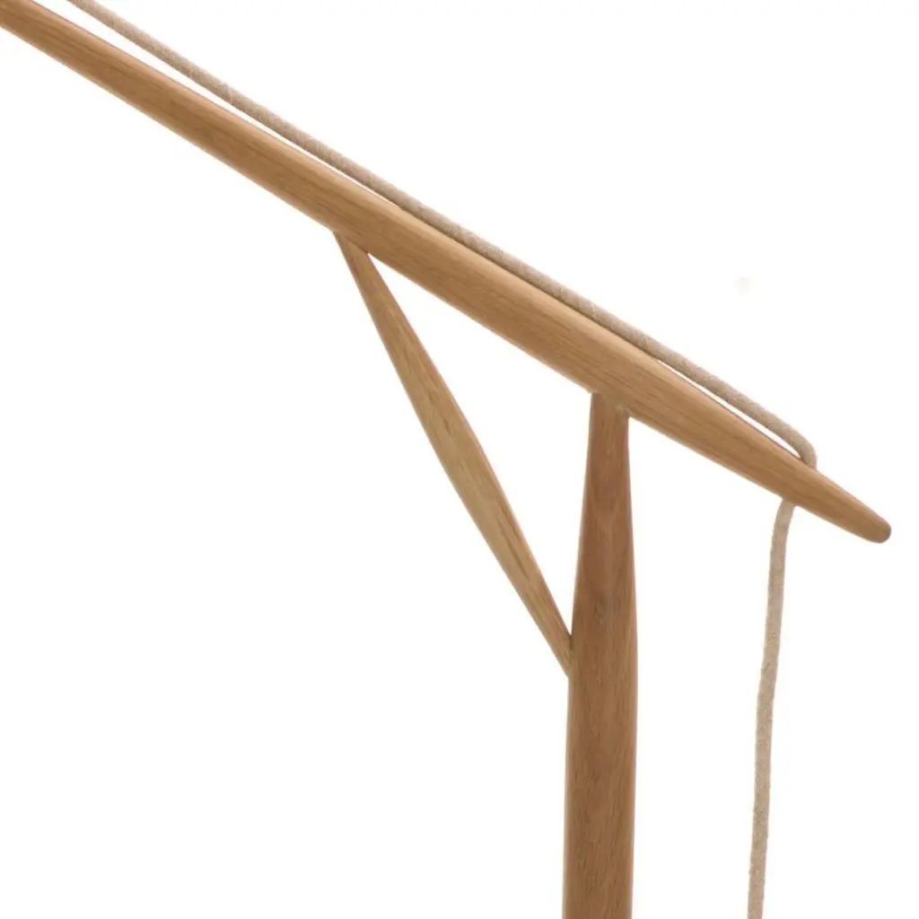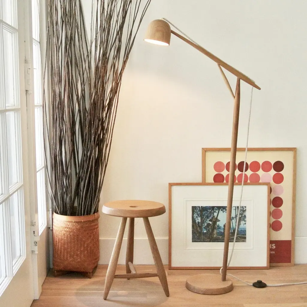 The Crane Floor lamp displays delicate components that celebrate the best qualities of wood craftsmanship. The grain texture stems from the careful and deliberate process of turned wood fabrication. The lamp has a seamless angular design, cotton cloth-covered cord, weighted base, and brass fitting, all of which illustrate artistic ingenuity. Warm, modern, yet highly functional, the Crane Floor is an integral piece of any modern furniture collection.