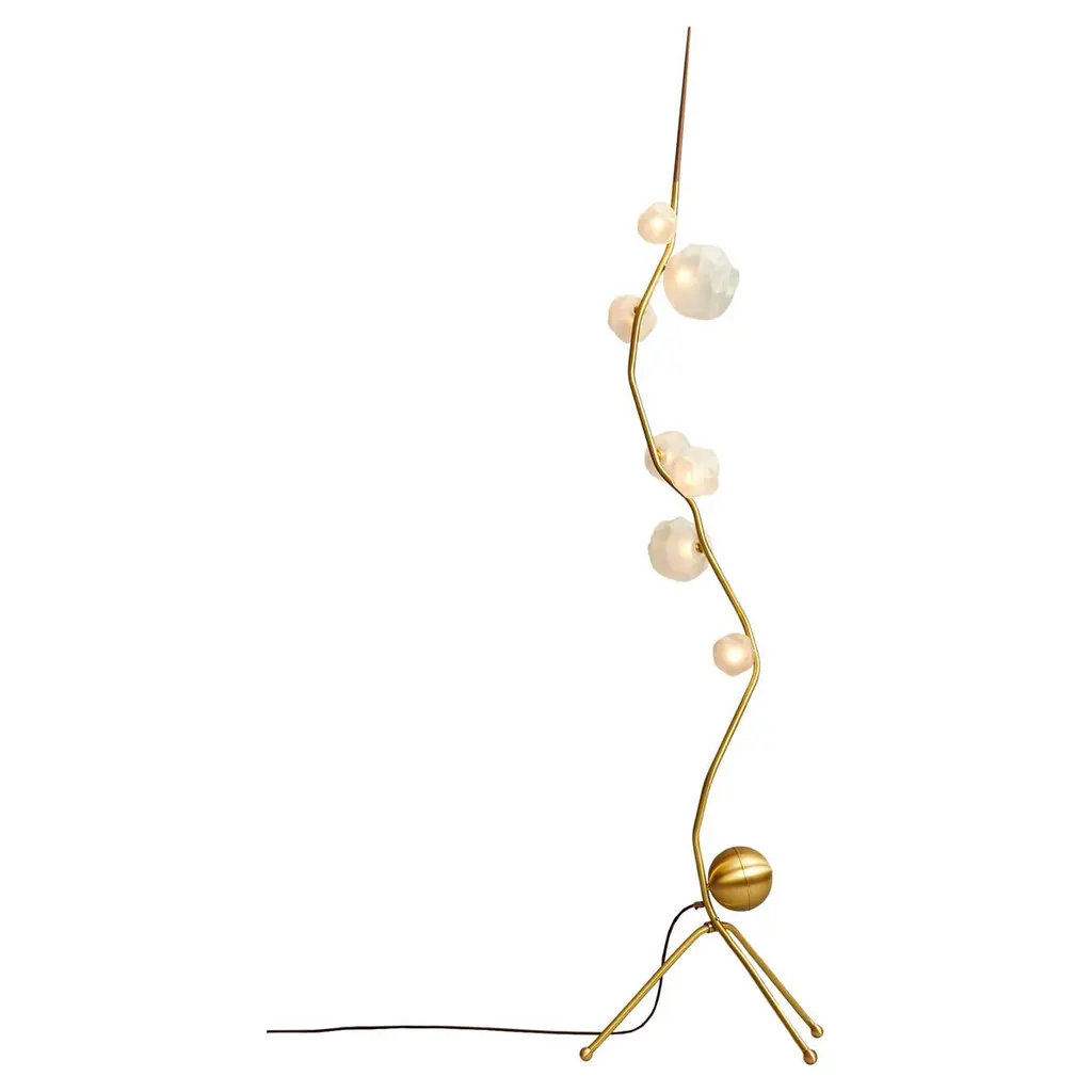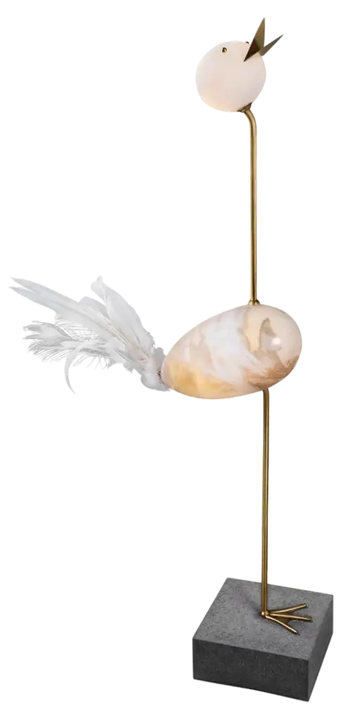 Crane, unique floor lamp sculpture, Ludovic Clément d’ArmontBlown glass, textile, brassDimensions: 125 x 55 x 25 cm Ludovic Clément d’Armont is in the continuation of a family tradition of centuries of gentle glassmakers, painters, carpenters and artists. Both engineer and artist, he imagines new lightings combining creative emotions with optical, electronic, thermal, environmental, electrical, chemical, color, energy, mechanical and medical knowledge. His pleasure is do discuss with his clients to achieve the ideal model. Ludovic presents his approach: “First, the simplicity of my work is based on a fundamental thought: an artistic evocation of nature. My creative process marks the new identity of mathematics and nature: the selective experimentation of the nature and human research lead to the same decisions. That is why, analysis and experimentation mingle in my creation. Because the intelligence of nature is only the long time of his experiments, just like that of man is only the number of its research. The aesthetic result aims to illustrate and proclaim this, in a dreamy and amazed shout, showing the fusion of sciences and life. The place of the man inside the universe becomes clear. Emotions and sexes are the result by elimination aiming to perpetuate: without absolute, humanism becomes the demonstrated organization of society.”Semeur d’étoiles gathers around Ludovic Clément d’Armont artists, engineers and craftsmen to design and manufacture exceptional light creations. As decorative lighting is often disappointing, Semeur d’étoiles creates more than just lightings: we make art pieces. Semeur d’étoiles is not limited to a material or a technique: we find new ways of manufacturing blown glass, crystal, porcelain, metal. Simultaneously, we work the light in theoretical and experimental ways so that it echoes with these materials, textures and shapes. This enables us to offer new and various light effects. To put these effects in volume, Semeur d’étoiles relies on its mastery of technical complexity. Nevertheless, we hide the technical components so that only the beauty of light and materials can be seen. Semeur d’étoiles is committed to an eco-design approach with ADEME (recyclable materials, manufacturing processes, reduced packaging, transportation, reduced consumption, recycling). And as ecology is nothing without human respect, Semeur d’étoiles also takes great care of supply. A creation can result of your own inspiration: each of our pieces can be customized. We propose numerous models of LEDs (a variety of shades of white, lens shapes and light intensities), a wide range of materials, dimensions, shapes, finishes, etc. If you wish, we will create for you a unique and spectacular piece. The originality of our creations and our technical skills are evidenced by the loyalty of our customers, by our internal laboratory, by the grant of patents and models and by the obtained distinctions.