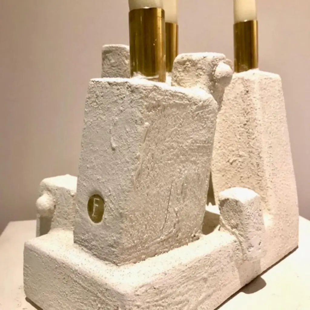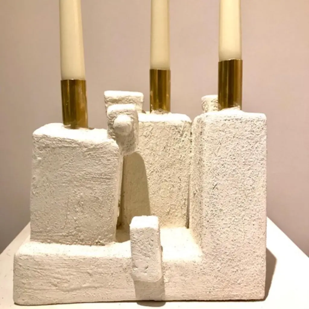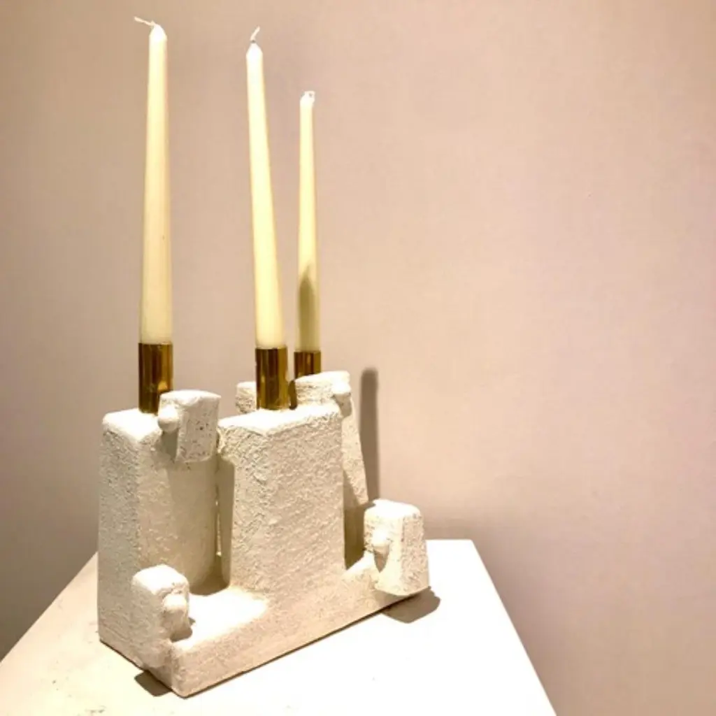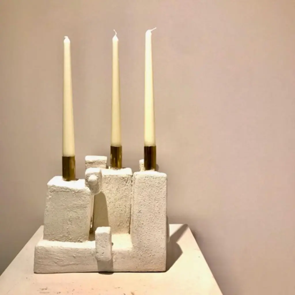 Cray Candle 3 Candles by Frederic TexierDimensions: W 25 x D 17 x H 25 cm. Materials: Concrete coated with lime and cement. Metal part : brass. Color: Cray.Artist Frédéric Texier expresses a passion for craftsmanship through his work, using abstract sculpture as an outlet for emotions. Sculpting brutalist and reassuring shapes in concrete blocks left over from renovation sites, Texier creates beauty across unique totems, consoles, floor lamps and candlesticks.