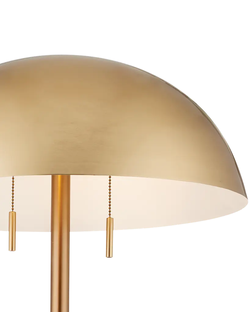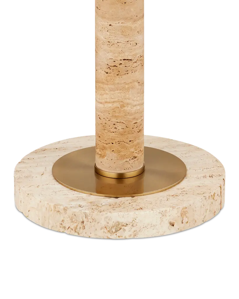 Aimee Kurzner designed the Miles Floor Lamp; the travertine lamp inspired by other pieces with the same name. The mid-century modern vibe is enhanced by the simple shapes of the lamp's base and body, and the domed brass shade that caps it. Because this beige lamp is made of natural stone, texture and color may vary from lamp to lamp. Wipe clean with a soft, dry cloth or static duster. Always avoid the use of harsh chemicals or abrasive cleaners as they may cause damage to the item's finish. Travertine is a porous, pitted stone. Due to the use of natural materials, handmade craftsmanship, or hand finishing, expect some color variances. Hand crafted pieces may have slight size differences.