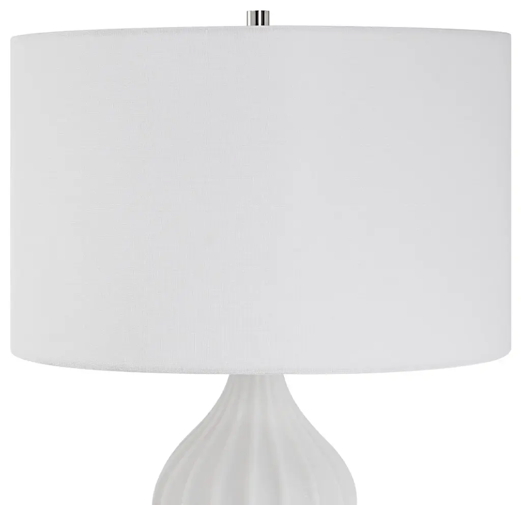 Inspired by the feminine form, the Monica Floor Lamp is made of wood in a white finish with an incredible sheen. This undulant white floor lamp brings a graceful element to any space. Topped with a white-linen shade, the pale design ensures it remains a luminous piece whether the light is switched on or off.