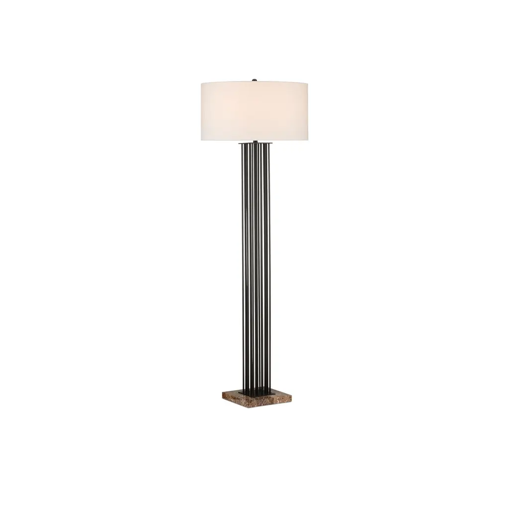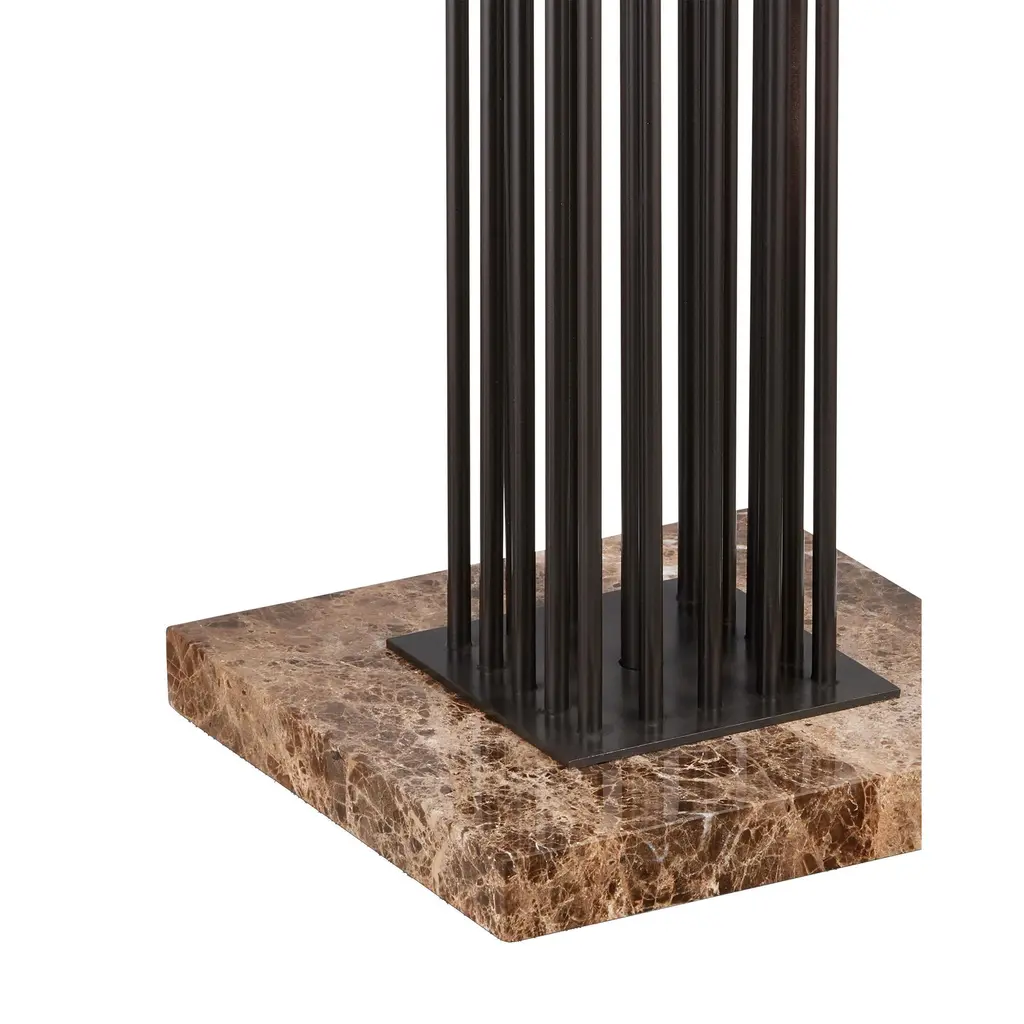 The style of the Prose Floor Lamp is described as "dressed-up industrial." The arrangement of the thin ribs of metal seems to change when the black floor lamp is seen from different angles. The metal on the contemporary lamp is in a bronze finish, and the base is made of coffee brown marble that has tremendous veining for a contrast to the sleeker elements. The Prose is topped with an off-white linen shade.