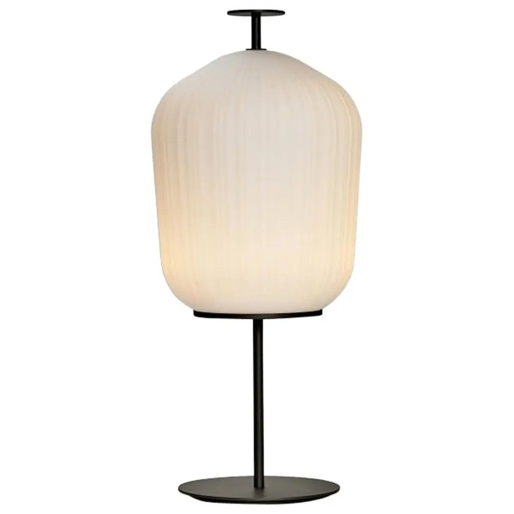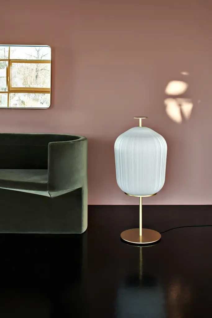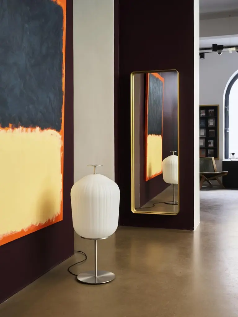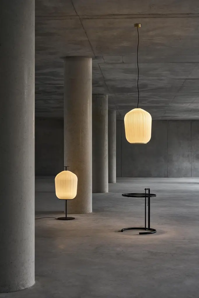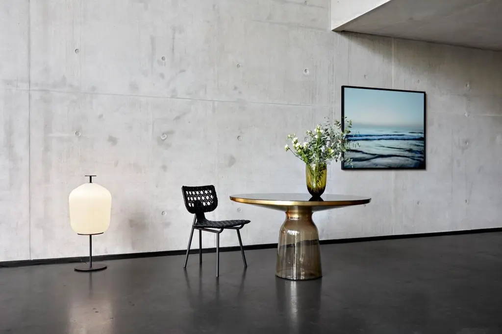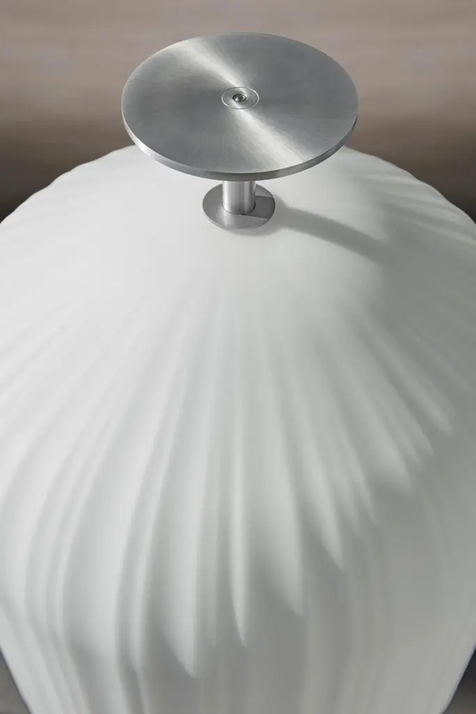 With his Bell Table design, which kicked off his cooperation with ClassiCon in 2012 and was the designer’s first step towards international recognition, Sebastian Herkner turned our usual perception of materials upside down. Herkner once again achieves this effect in a fascinating way with his Plissée Floor Lamp: the lampshade, like a sensual, weightless balloon of light, balances on a metal base.The trick: what is reminiscent of artfully pleated textile is in reality hand blown glass. An elaborate artisan production process enables this soft, textile-like, visual effect and hence the realisation of Herkner’s vision. A dimmable LED light source creates the individually desired level of cosiness. The design of the Plissee floor lamp hence unites traditional craftsmanship with an industrial component – and, not least through this combination, carries the unmistakable signature of Sebastian Herkner.Floor lamp. Frame aluminium, black or bronze lacquered or brass anodised lacquered. Hand blown lamp shade white satin-finished opal glass with pleated surface. Push switch integrated in top of frame, variably dimmable with memory function. Black felt gliders.