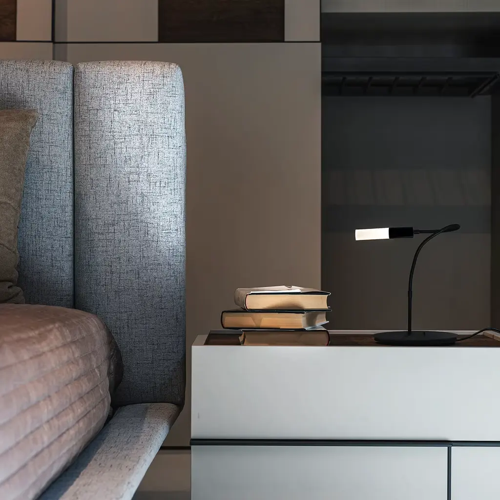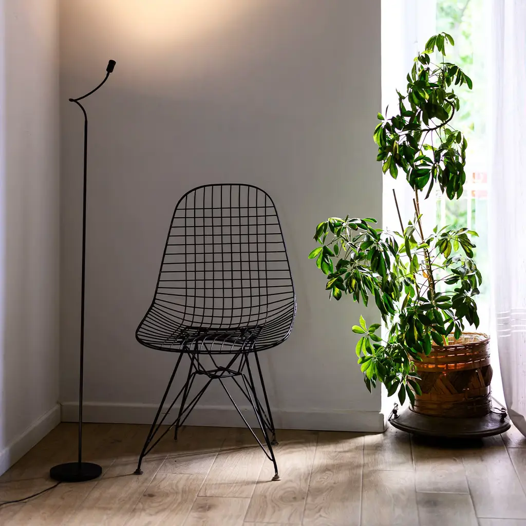 Sleek, simple and slender, the Daily Floor Lamp adds flawless elegance to any room with its strong yet slender structure perfect for a quiet corner in the living room or bedroom. Crafted of matte black metal, the slender stem stands on a round base (Ø16 cm) and the flexible arm can be moved to direct the light where desired. Available with the option of punctual light with 30° lens or diffused light with acrylic diffuser (featured), this lamp's minimal aesthetic makes it perfect for contemporary interior decor. Total length when fully extended is 142cm.