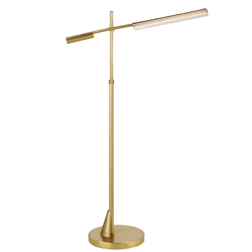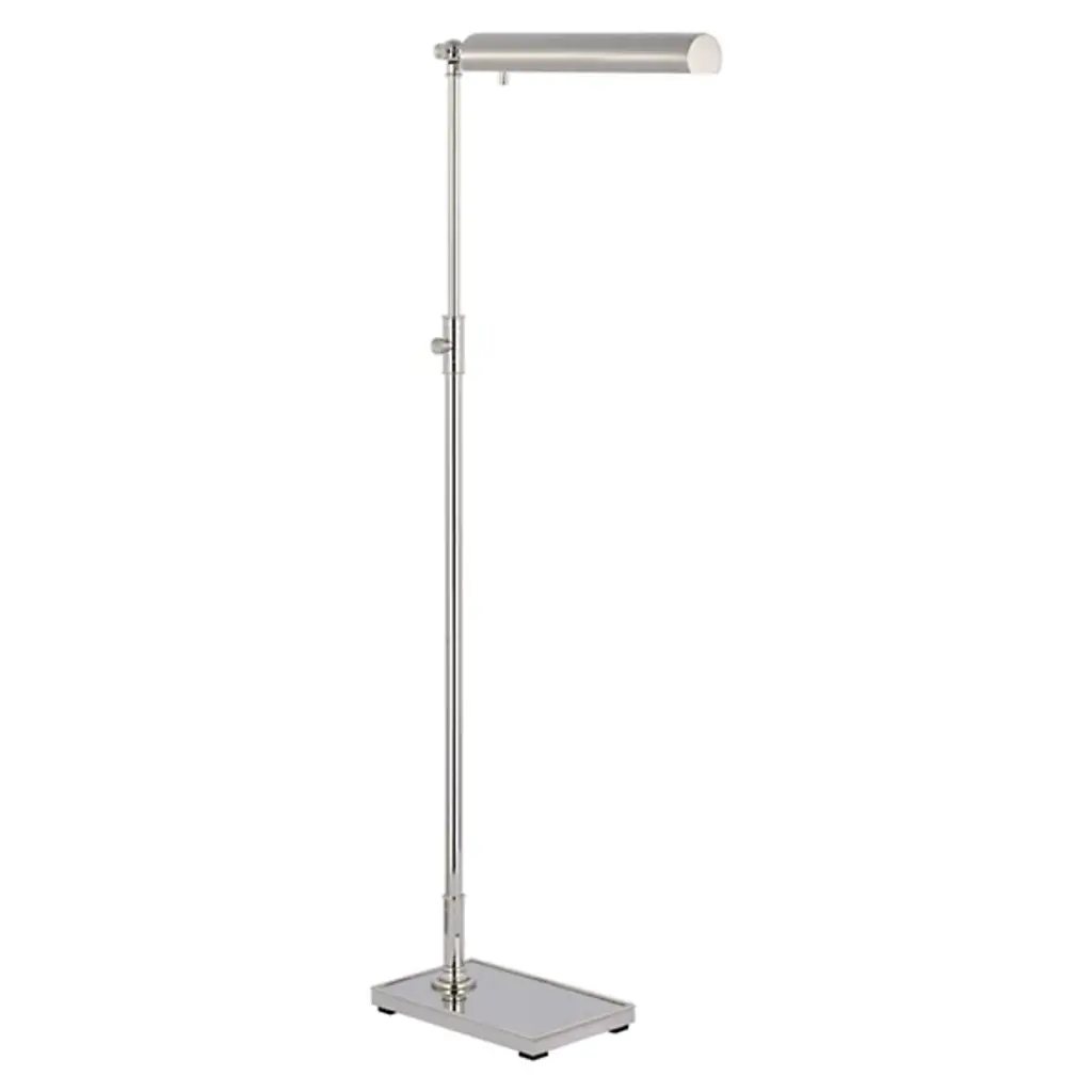 Clean and modern, the Daley LED Adjustable Floor Lamp by Visual Comfort Signature, formerly known as Visual Comfort, is an appealing and practical addition to the home. From designer Ralph Lauren, this fixture is crafted from steel and stands tall atop a circular disc base. Its slender step travels upward to a traversing arm that can be adjusted at the joint. A half-cylinder made of clear acrylic glass conceals an integrated LED light source as it diffuses its light to offer an ambient glow around the room.