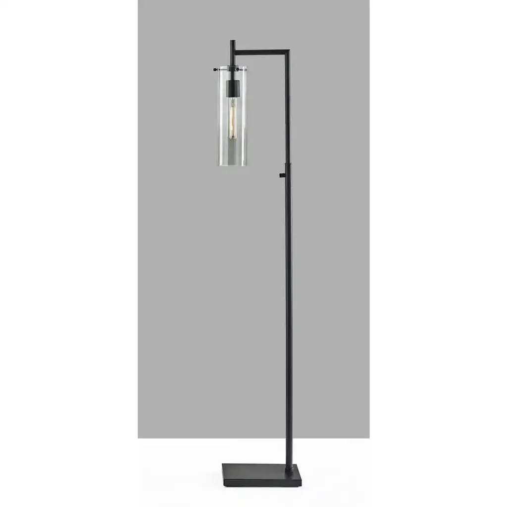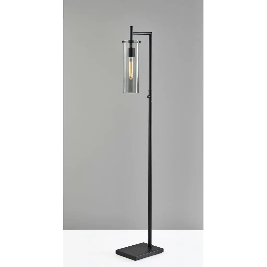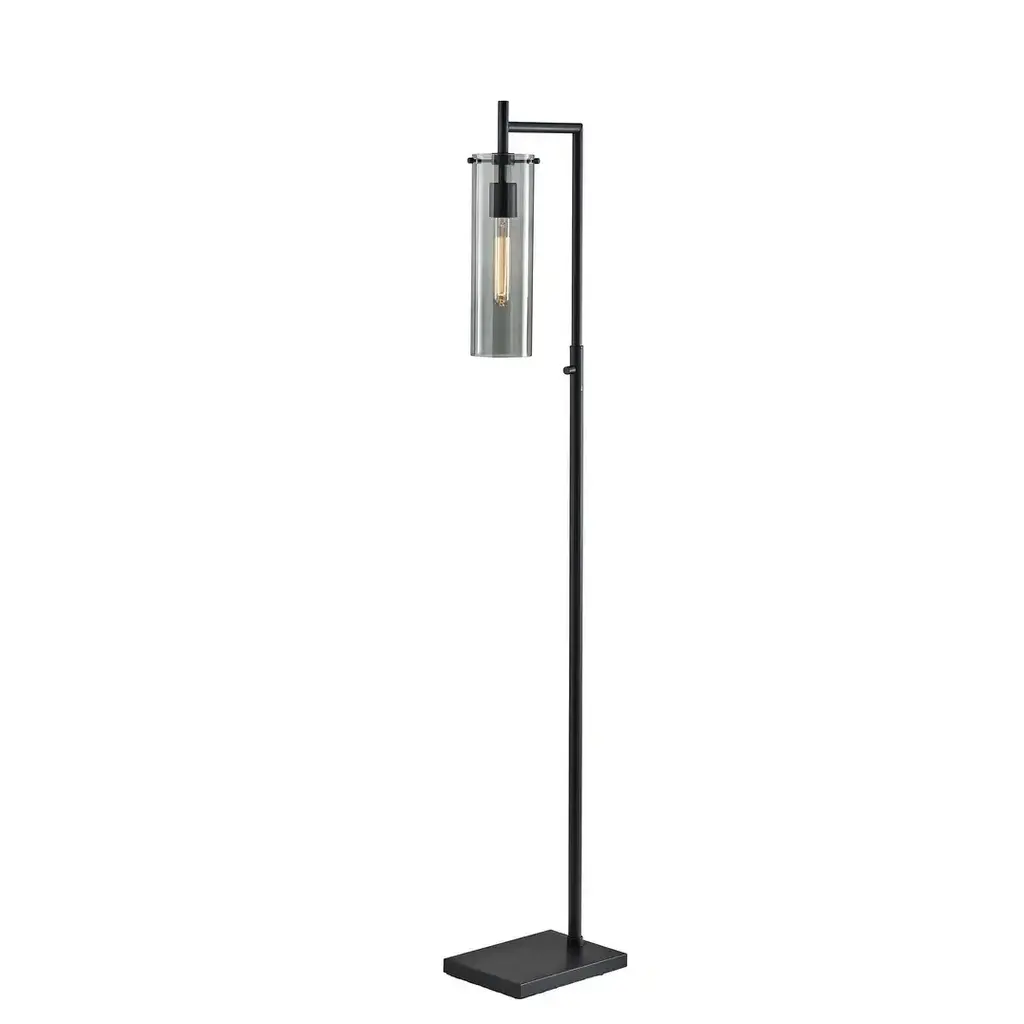 With clean, simple lines, a black metal finish, and vintage Edison bulb, the Dalton floor lamp integrates seamlessly with industrial and modern chic styling. This 62.5" tall lamp's small footprint and narrow profile make it a space efficient choice for room corners or beside furniture. Anchored by a rectangular base crafted of black metal, a matching narrow pole extends straight before meeting with a short arm at a 90° angle. Suspended from the arm is a luxuriously styled smoked glass cylindrical shade that leaves the included 40W Edison tube bulb visible for striking, vintage appeal. The lamp is easily operated by a discreet rotary switch located on the pole. To illuminate larger spaces, the Dalton floor lamp is also available with a dual-light design. Complete your décor with the Dalton wall lamp, desk lamp, and pendant light.