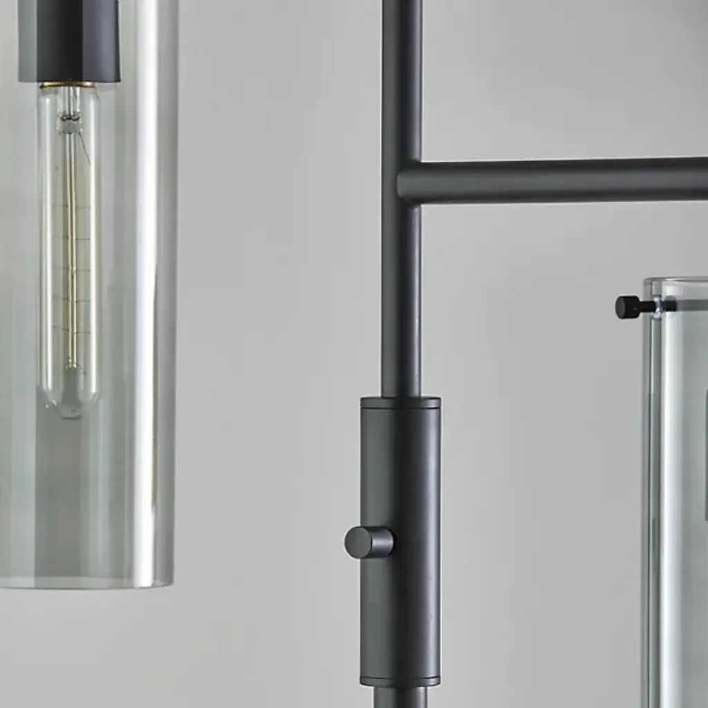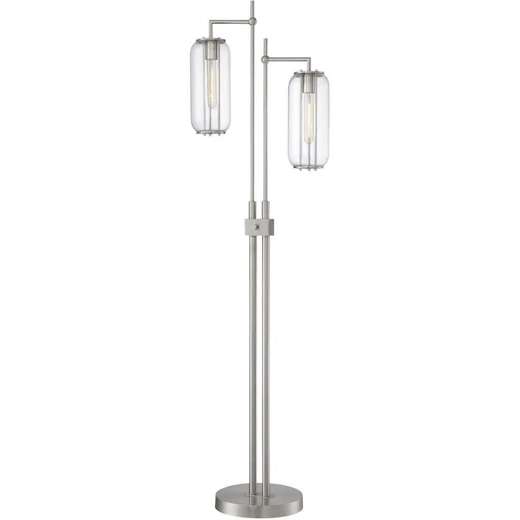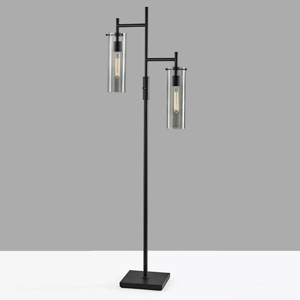 Bring a comforting layer of light to your home with the sleek silhouette of the Dalton 2 Light Floor Lamp from Adesso. A precise square base made of smooth metal extends a lengthy and slim, central body that itself mounts a pair of thin arms and cylindrical, clear glass shades. A tube-shaped bulb is tightly enclosed within each shade. They emit a warm and inviting presence to the space, creating the perfect ambiance after a long day.