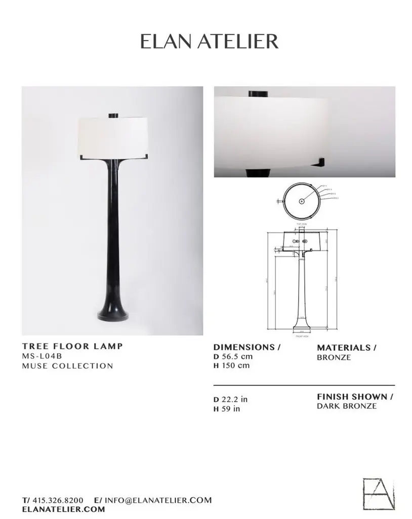 Dark Bronze Tree Floor Lamp by Elan AtelierTree lamp is made from a solid cast bronze base in our dark finish. The lamp was inspired by Classic shapes in nature and resembles the tree trunk which is a symbol of strength and power. Comes with 40watt LED lamp and dimmer. Custom sizes and alternate finishes by request. Includes white linen shade.Dimensions/dia 56.5 cm x h 150 cmdia 22.2 in x h 59 in