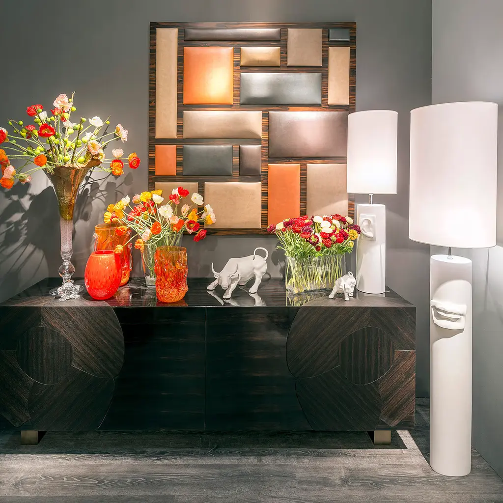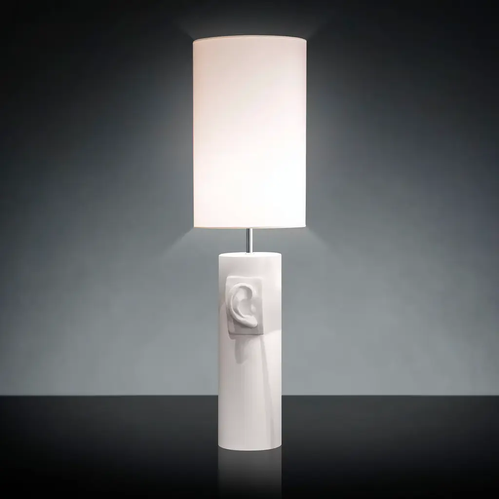 Marked by a sleek cylindrical silhouette, this white ceramic lamp belongs to a series of vases and floor/table lamps that celebrate Italian art and handicraft. A piece of strong visual impact, this modern design features a tall lampshade housing a single E27 max 50W bulb that diffuses a soft illumination all around and direct lighting to the base below featuring a magnificent low relief of the ear from Michelangelo's iconic David sculpture.