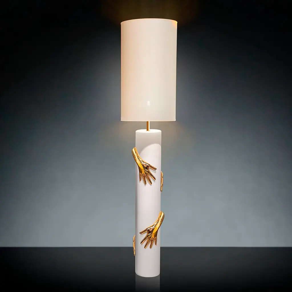 Featuring a captivating composition of polished gold and white ceramic, this superb floor/table lamp combines a minimalist silhouette with a relief insert in the shape of four hands almost looking alive as they embrace the cylindrical stand. The 24k gold plating on the hands, lamp holder, and lampshade interior is an unexpected, sophisticated contrast that will make a glamorous statement in any home.