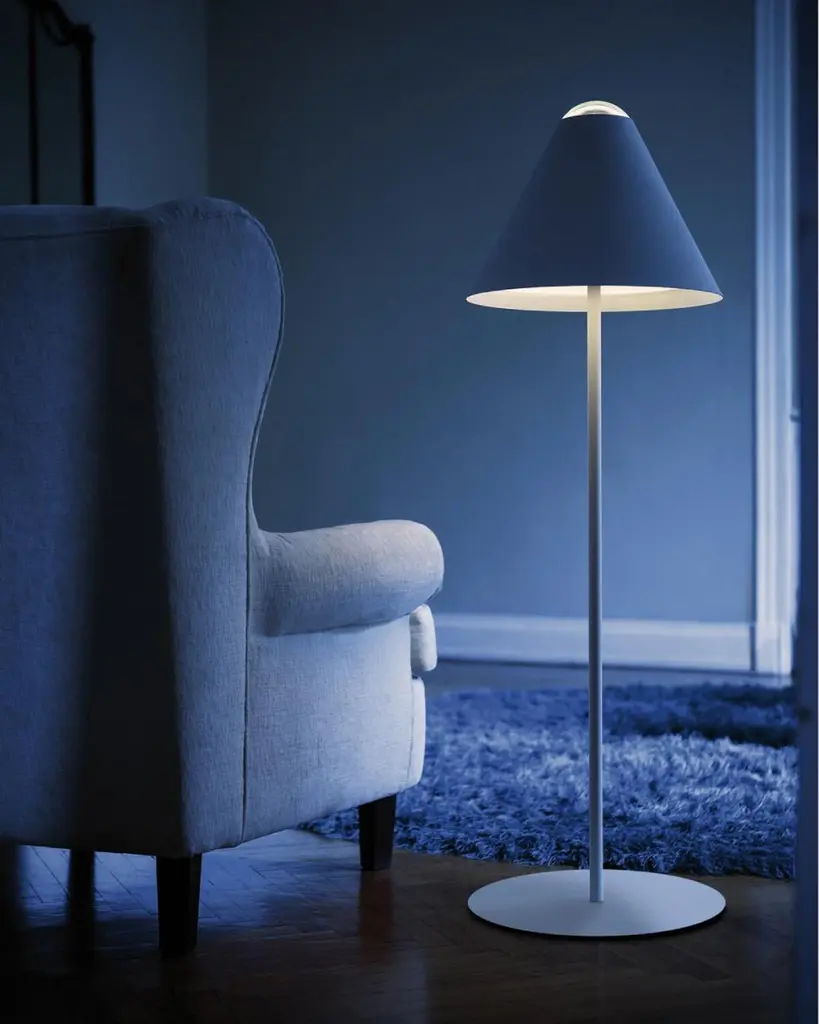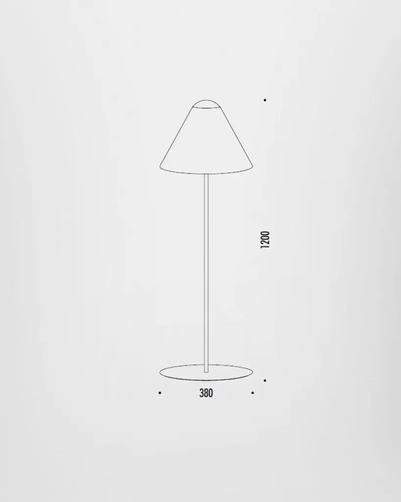 Inspired by the shape of a traditional lampshade.The bulb is not shielded but displayed, and it peeks out from the shade.Table version available.Color: Matt white.Max 10W - E26120V - 60HzBulb not includedDimmer on boardDIMENSIONS:Ø 38 cm x 120 cm