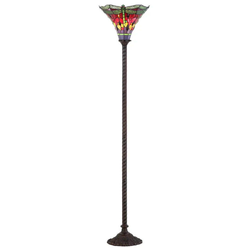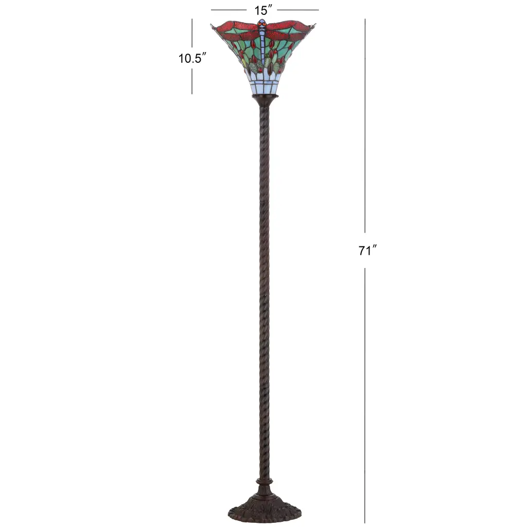 One of the finest techniques to come out of the Art Nouveau movement, the Tiffany-style stained glass shade on this torchiere floor lamp makes for a stunning addition to any space. While steeped in traditional design with it's barley-twist base and dragonfly motif on the shade, this piece is updated with the functionality expected today -- a step-on on/off button, LED bulb compatibility, and a beautiful silk-wrapped cord. Each shade is handmade by artisans who specialize in the intricate art of stained glass soldering. Features:Dimensions:About us:You see a lamp.We see a decorative work of art.A perfectly curved shade casts a dramatic shadow on a floor. A silk cord you never want to hide. Compatible with LED lightbulbs: as easy on the environment as they are on the eyes. The JONATHAN Y Lighting collection considers every detail from impeccably sourced materials to designer styling. And our prices are so attractive, we've transformed a functional necessity into a fashion accessory.JONATHAN Y Lighting - a fashion revolution in home decor.
