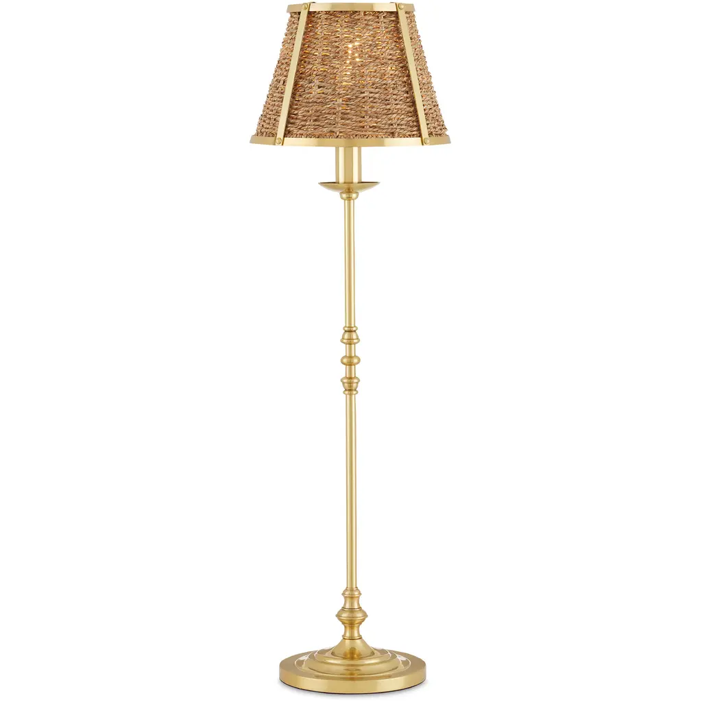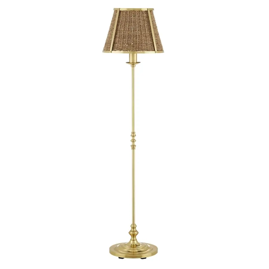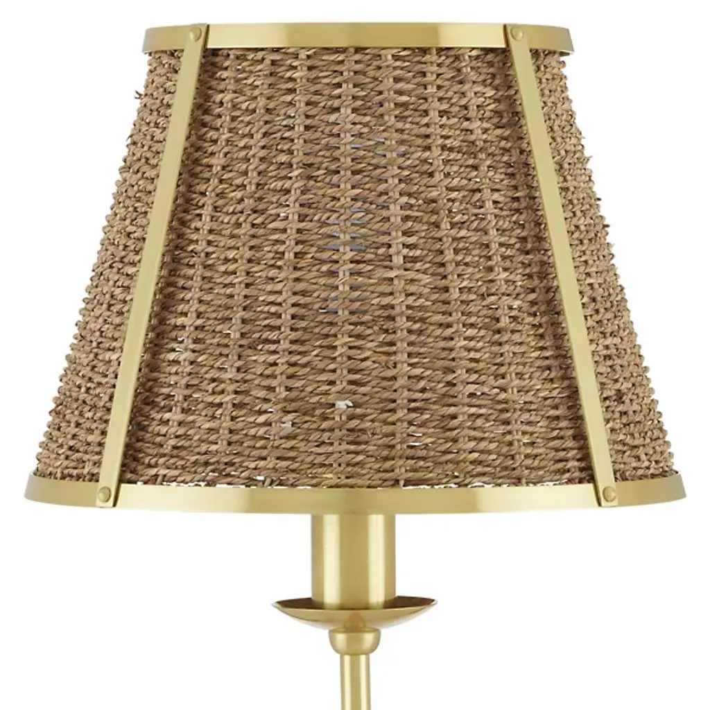 The Deauville Floor Lamp from Currey & Company reflects vintage discernment and elevates elegant vintage style. Designed by Suzanne Duin, founder of Maison Maison, it displays her discerning eye for authentic French antiques. Handmade by artisans, this floor lamp is a testament to craftsmanship, featuring a shade of natural seagrass that crowns a slender steel stem and burnished base in a polished brass finish. The tailored design, trimmed in gold, adds robust texture and refined French flair to any space. The hand-woven shades showcase artisanal properties, adding clever character to each fixture and dispensing a focused wash of light below