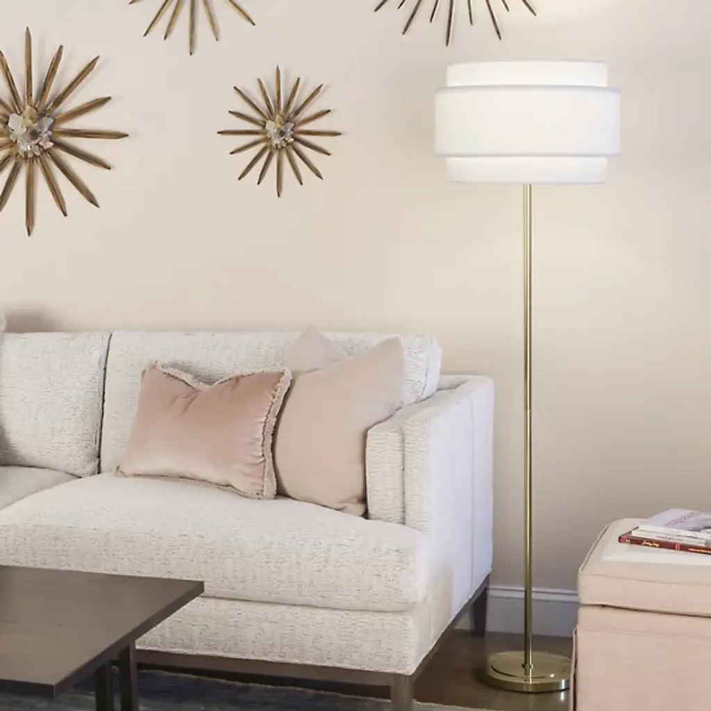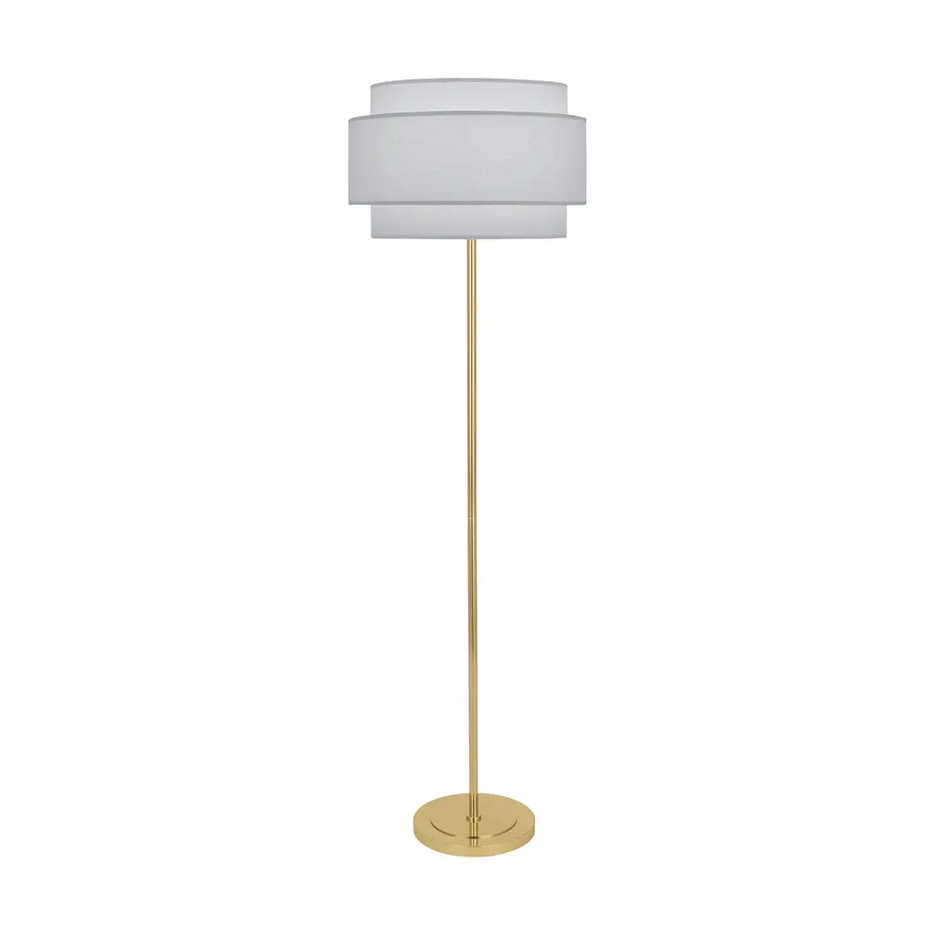 Simple and refined, the Decker Floor Lamp from Robert Abbey brings an elevated sense of style to its environment while remaining simple enough to blend in. A sleek metal base sends a thin stem upward to the lamp’s incandescent light source. Nested fabric shades are set atop the piece, filtering warm light outward while allowing light to funnel both upward and downward to fill the room. Elegant and minimal, this fixture sets a serene tone for the room as it brightens.