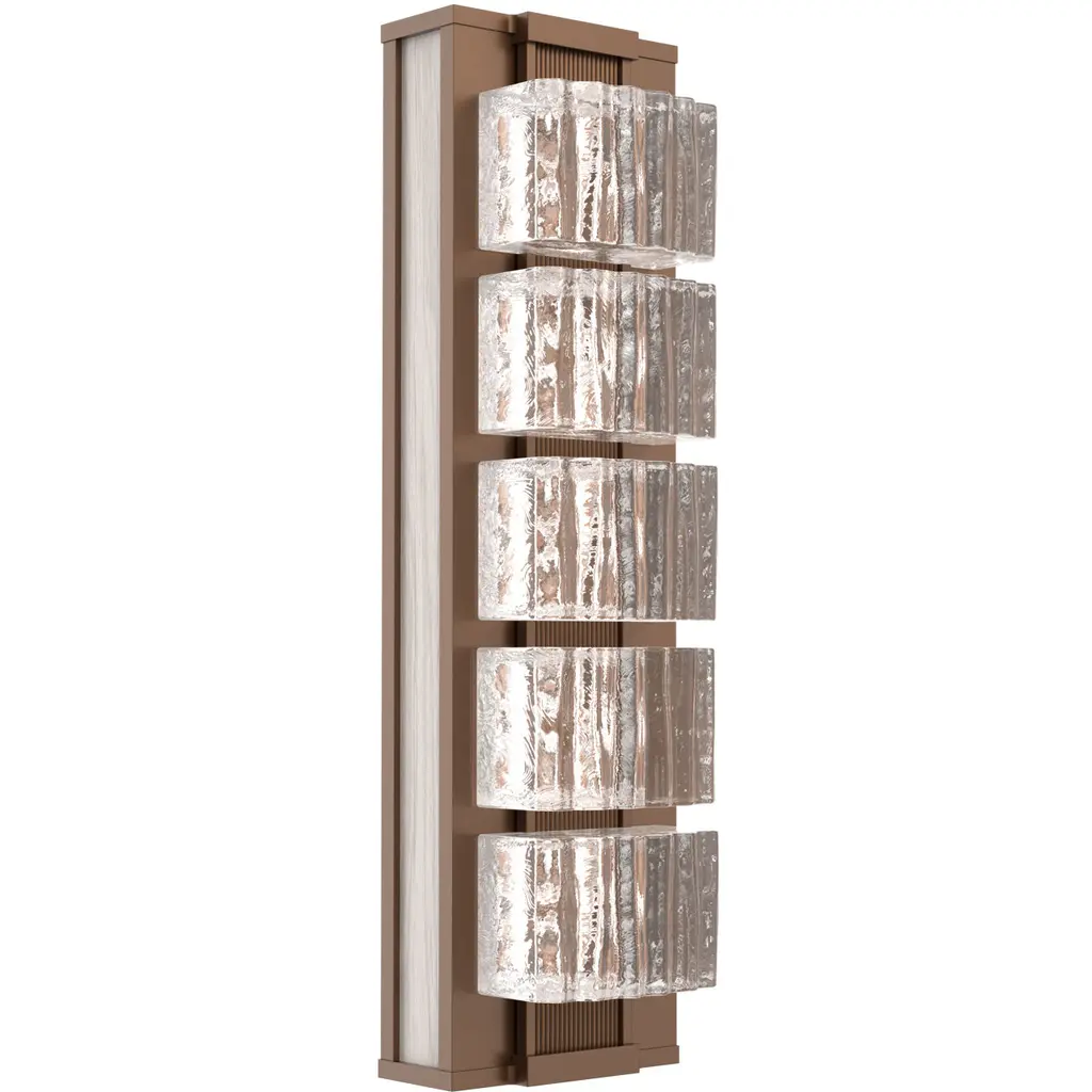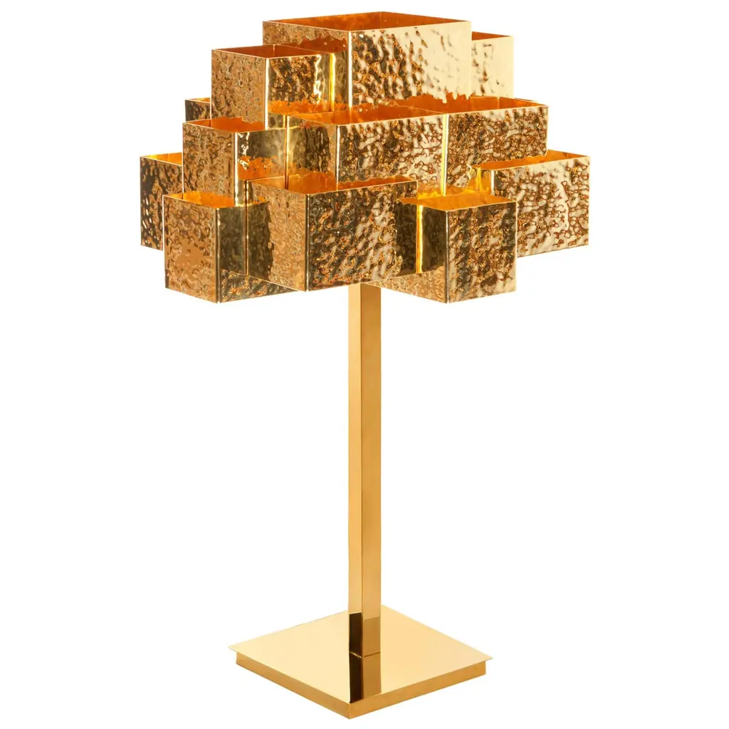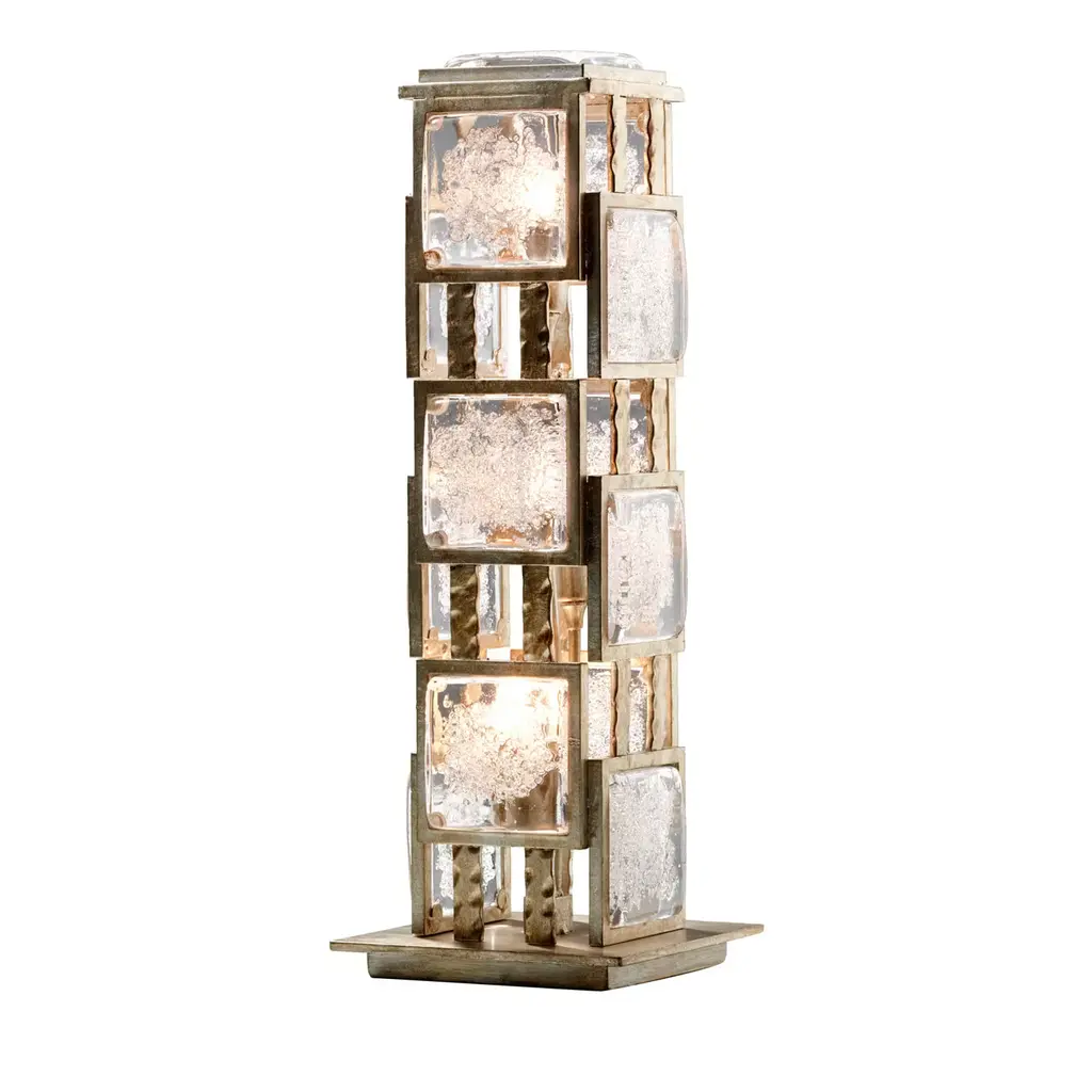 Boasting an eye-catching and imposing silhouette evoking the shape of a tower, this exquisite floor lamp strikes boasts a timeless bronze finish that stunningly complements the glass and grit tiles alternating with vertical metal stripes. The LED light sources (G9 and max 3.5W each) hosted inside the tower-like structure diffuse a cozy light in the surroundings through the innovative texture of the tiles.