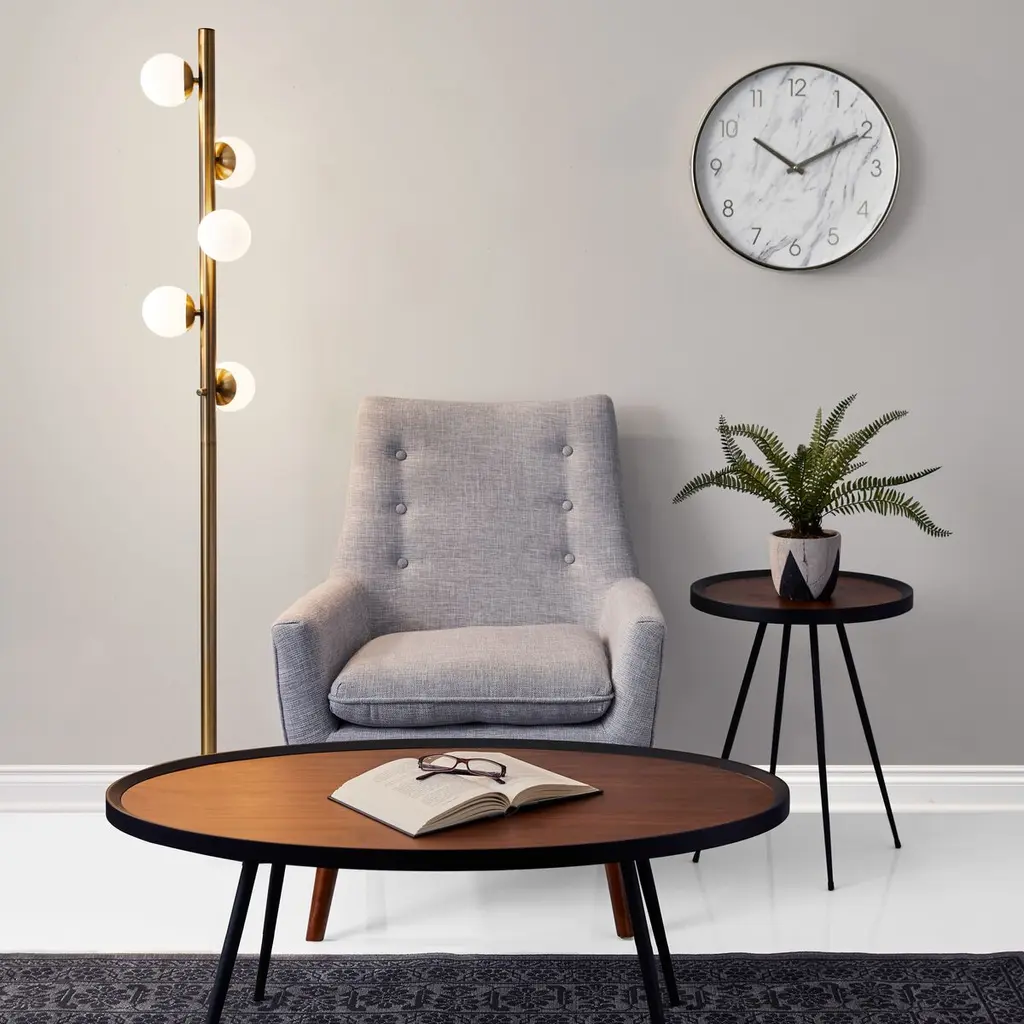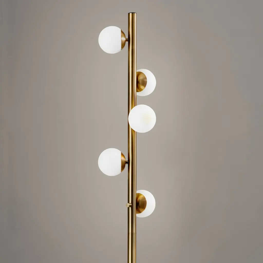Supported by a black marble base, this floor lamp is designed with white glass globe shades that climb up its antiqued brass body. LED bulbs included.