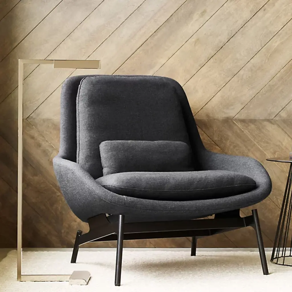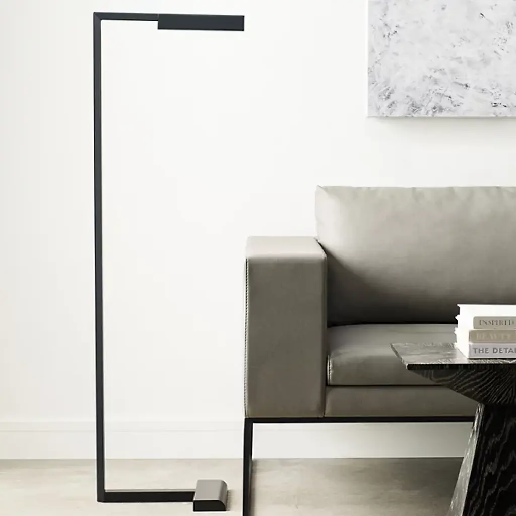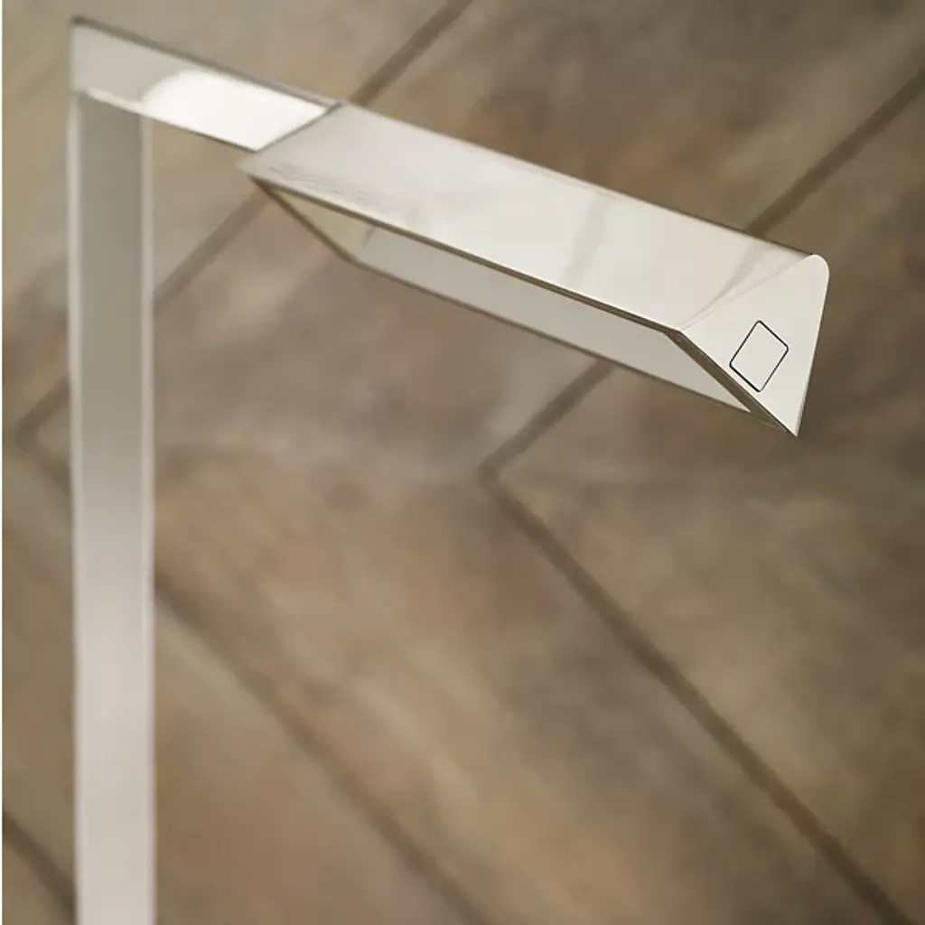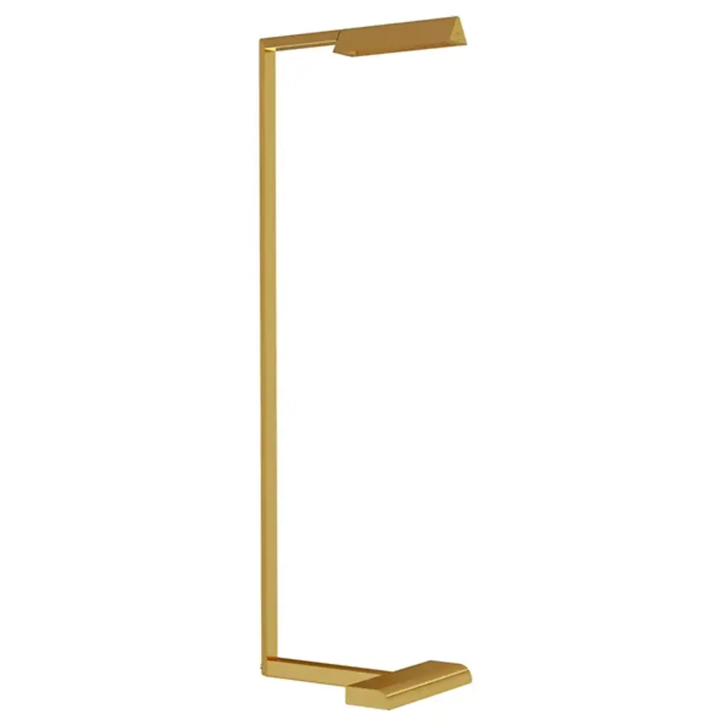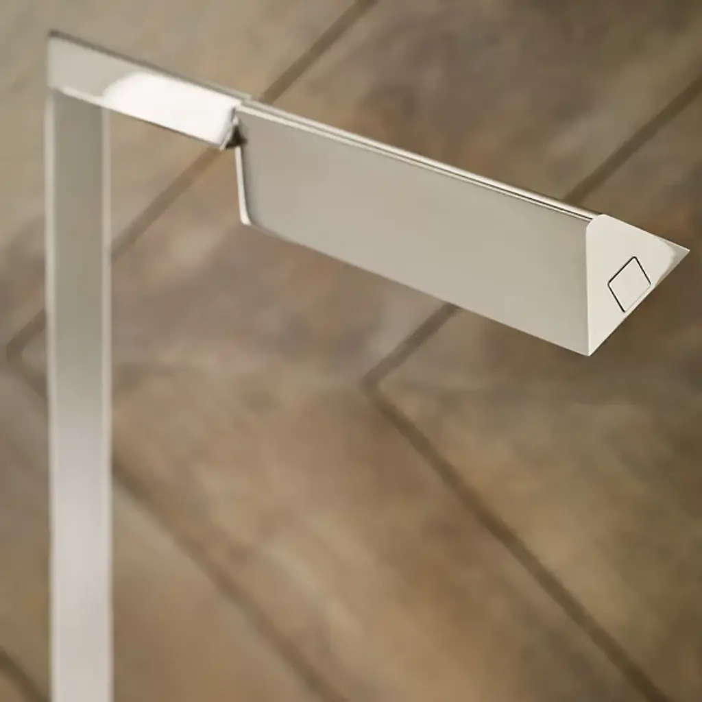 A sophisticated minimalist take on the enduring pharmacy lamp. Let the Dessau LED Floor Lamp from Visual Comfort Modern, formerly known as Tech Lighting, serve you as an elegant reading companion or an architectural accent for your room's ambiance. It's an unmissable design, cutting through the air in sharp angles and clean shapes. Its bracket figure comes to light with a streamlined base and an angular column. Perched at the top, its pointed shade keeps its touch-sensitive dimmer, light switch, and LEDs elegantly concealed. Turn it on for an even spread of clean illumination.