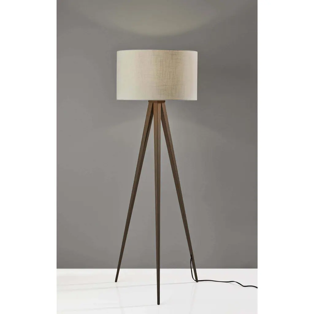 Introduce a warm, rustic accent to your living room or bedroom with the Director floor lamp. The walnut wood grain tripod legs are an angular counterpoint to the off-white textured drum shade. A sharp contemporary silhouette is softened by warm tones. A three-way rotary switch on the socket controls a 150 Watt incandescent bulb or equivalent CFL. The 3-way rotary socket switch will only work with a 3-way light bulb, otherwise this lamp will function with simple on/off switch at its highest setting. This lamp has a black cord that runs through the leg, hidden from sight. This lamp is also smart outlet compatible. Bulb is not included.