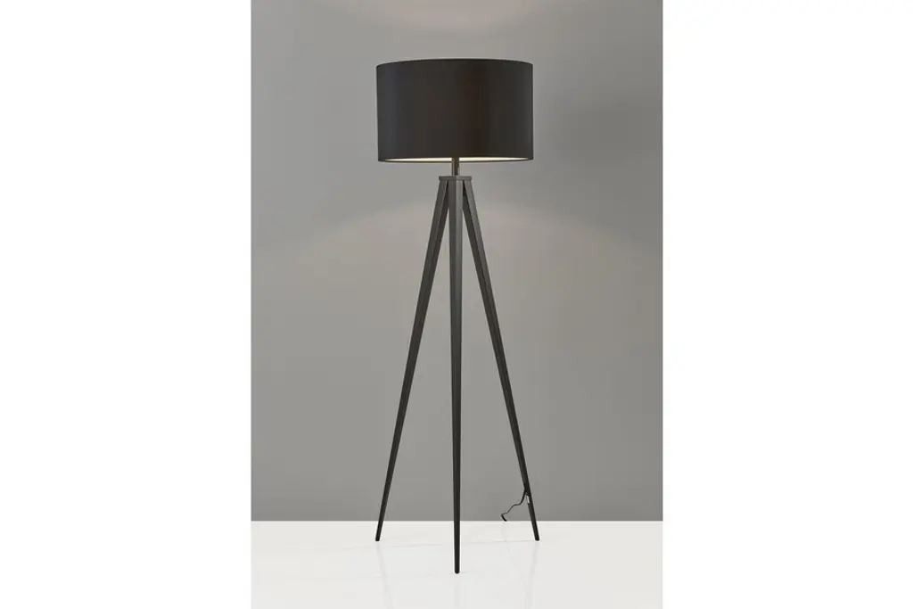 Incorporate the ultra contemporary Director Floor Lamp into your modern dcor for an instant style transformation. A unique black metal tripod base provides unparalleled stability and strength while making a dramatic statement. The gorgeous drum lampshade is beautifully crafted of black poly/cotton. Let the stunning Director Floor Lamp stir up some excitement in your living room, bedroom, or office space.Shade: 20"diameter x 12"h