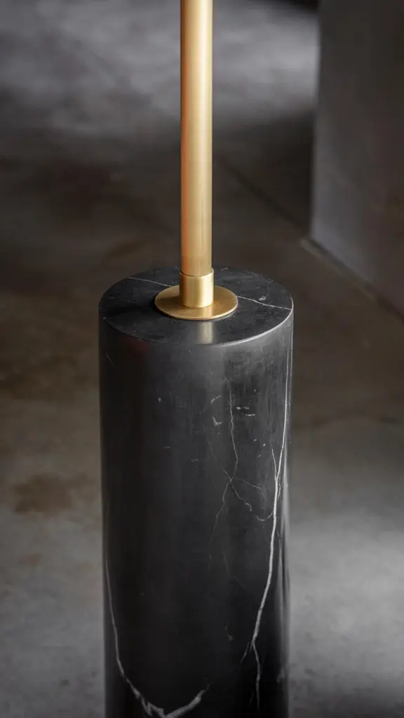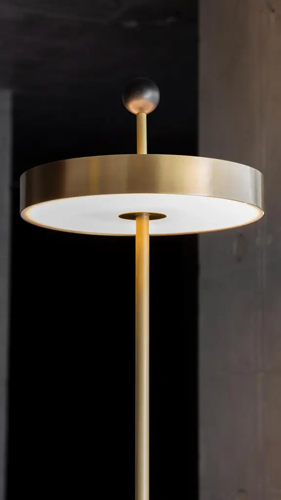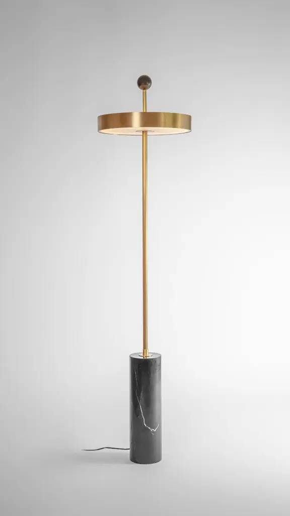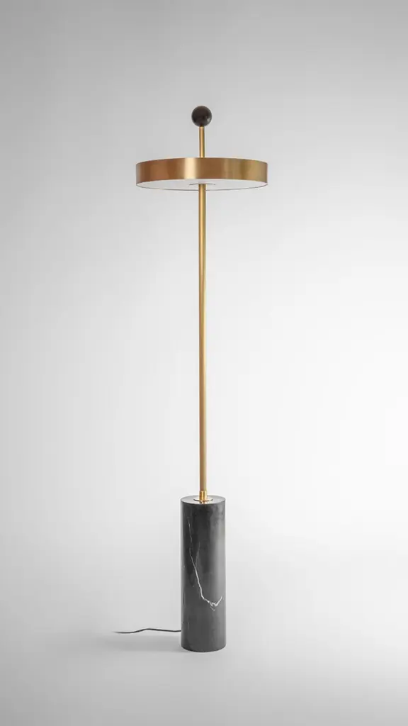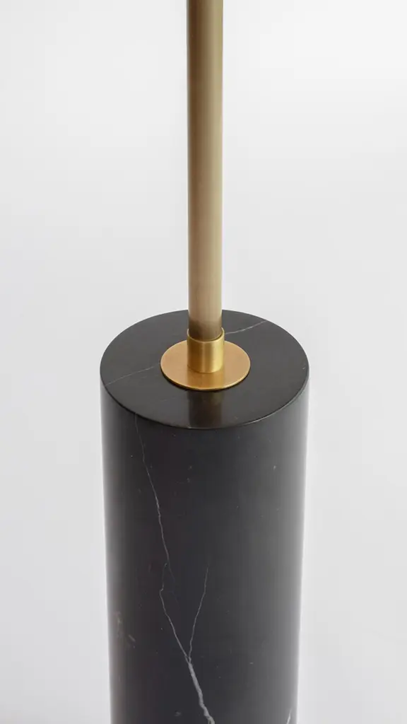 Disc and ball floor lamp by square in circleDimensions: H 165 x W 40 cmMaterials: brushed brass finish, black marble, powder coated black, opaque white acrylic diffuserA statement floor lamp with a disc-shaped shade, allowing the light to shine from the diffusers on the top and bottom. The central pole travels through the shade and is finished off on top with a black ball. At the base, you’ll find a black marble structure.Square in circle is a London-based design studio founded in 2019. The studio explores lighting design in minimal, geometric forms inspired by the Modernist Era. Materials such as marble, metal and glass combine to make each sculptural piece a 'total and complete work of art', as in the manner of Gesamtkunstwerk.All our lamps can be wired according to each country. If sold to the USA it will be wired for the USA for instance.