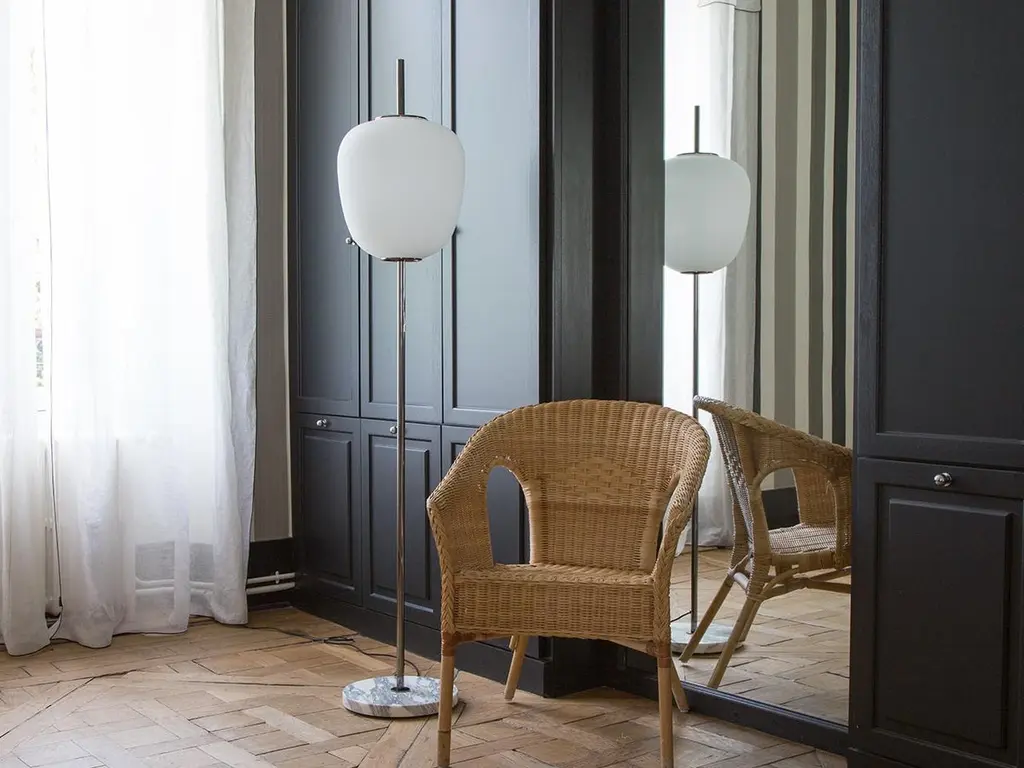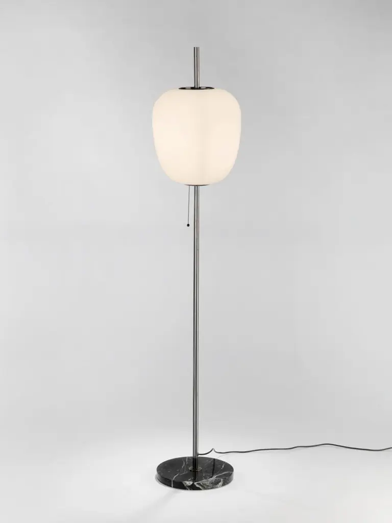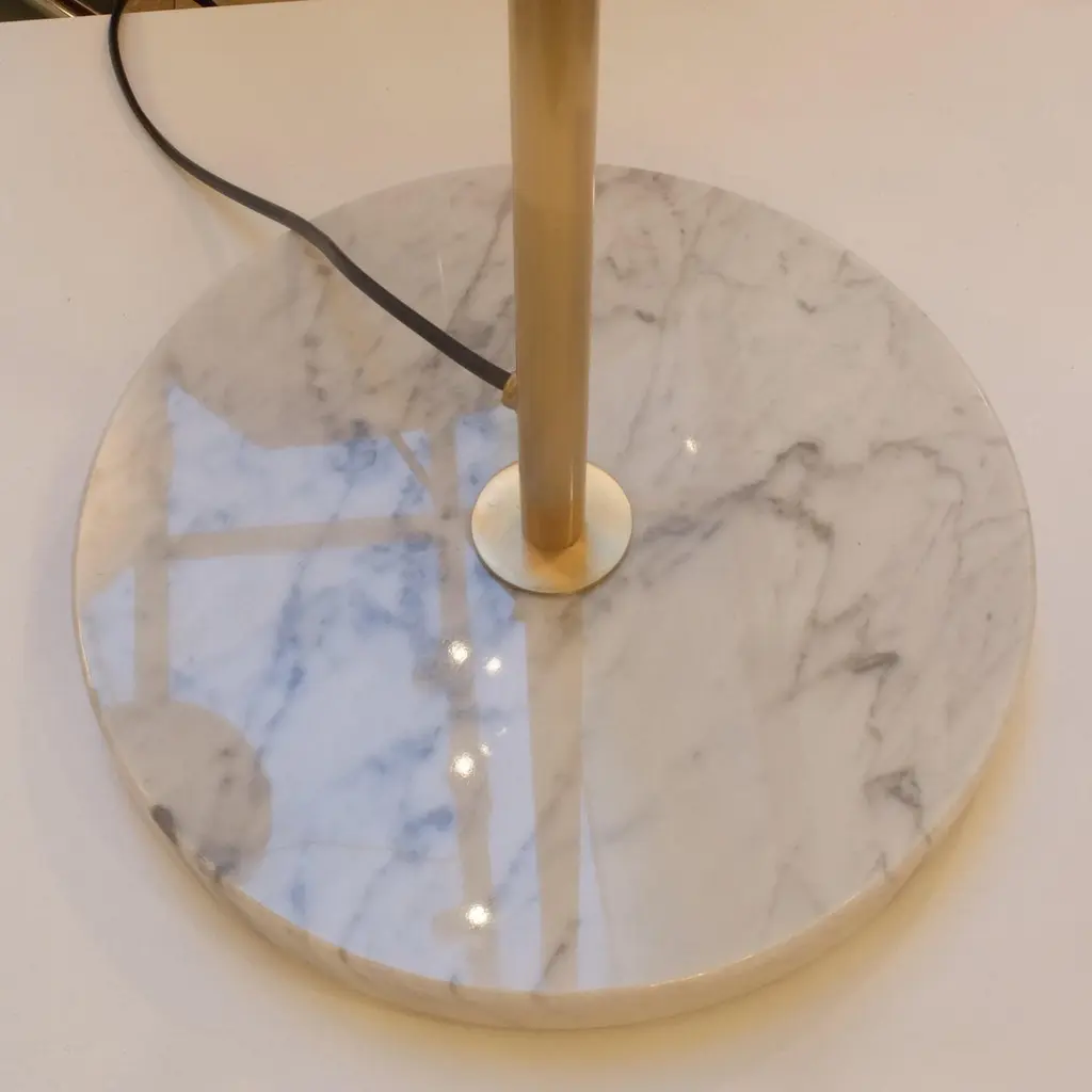 Floor lamp model J14, Joseph-André Motte for Disderot.Today the floor lamp J14 is a re-edition, individually numbered with the associated certificate to guarantee authenticity.The floor lamp, is made from chromed brass, standing on a base of white marble. The double layer glass lamp shade is shown to its' full beauty as either an individual lamp or as a pair, positioned behind a sofa as reading lights. The light beam can be positioned accordingly.UL CertifiedNumbered editionDelivered with authentication certificateMade in France.