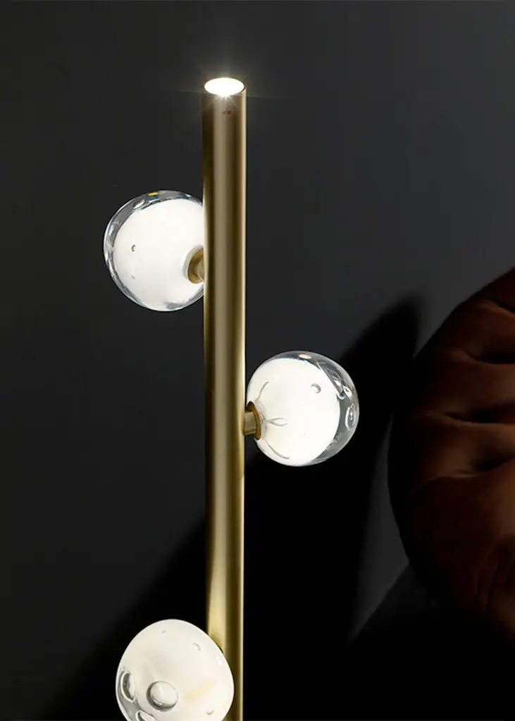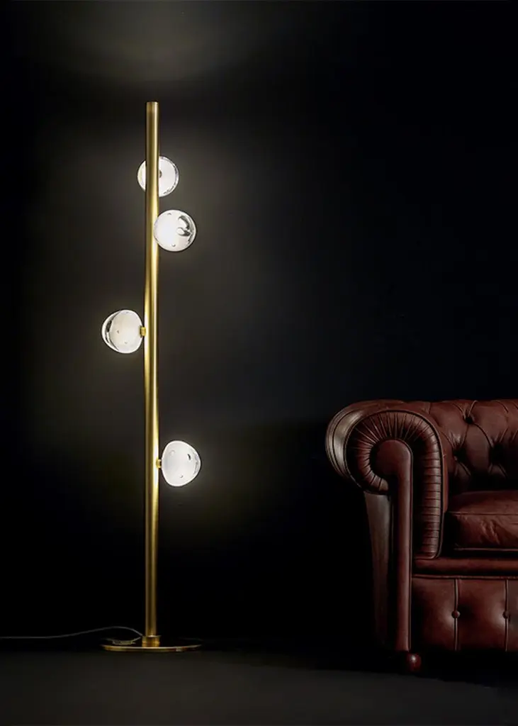 Floor lamp with cylindrical structure in satin-finish brass, and crystals made by hand. The light source is placed at the upper end of the lamp to emit a direct beam.