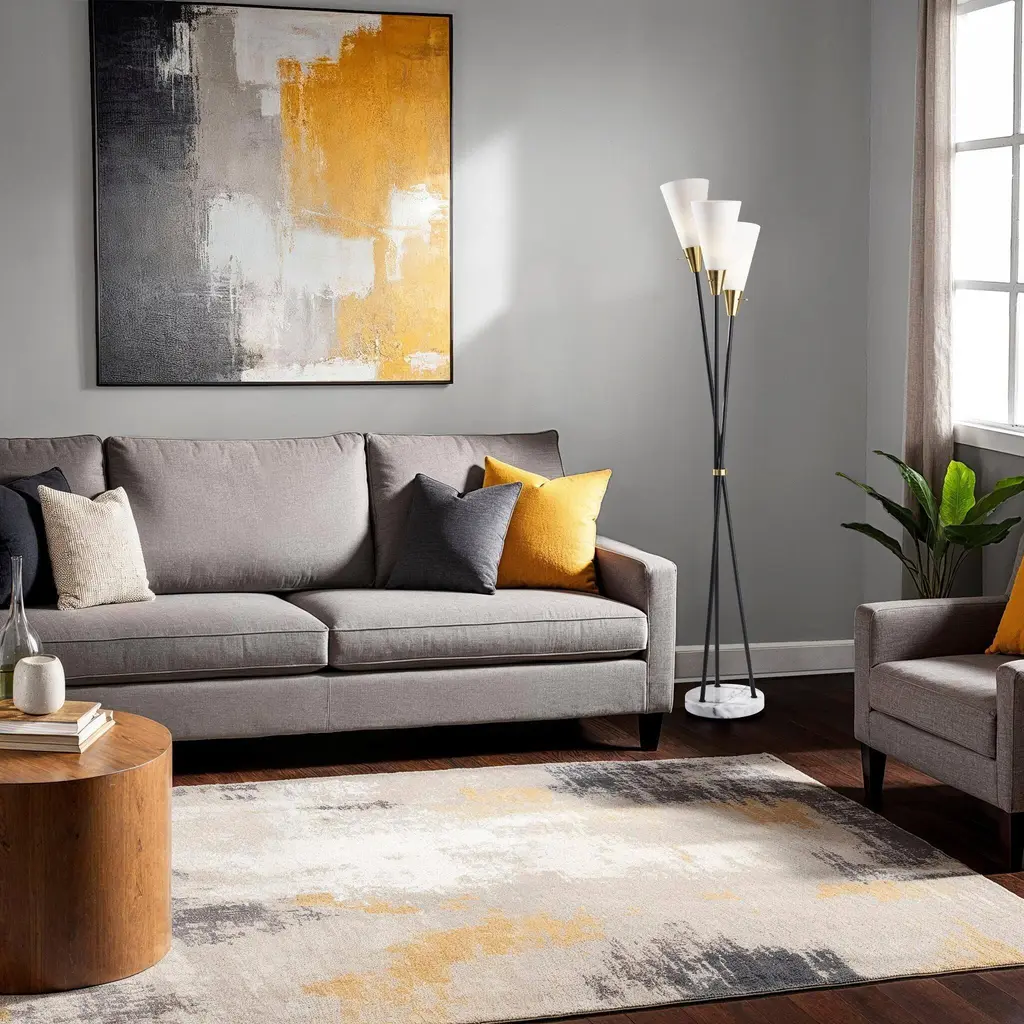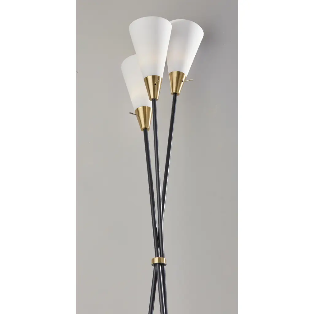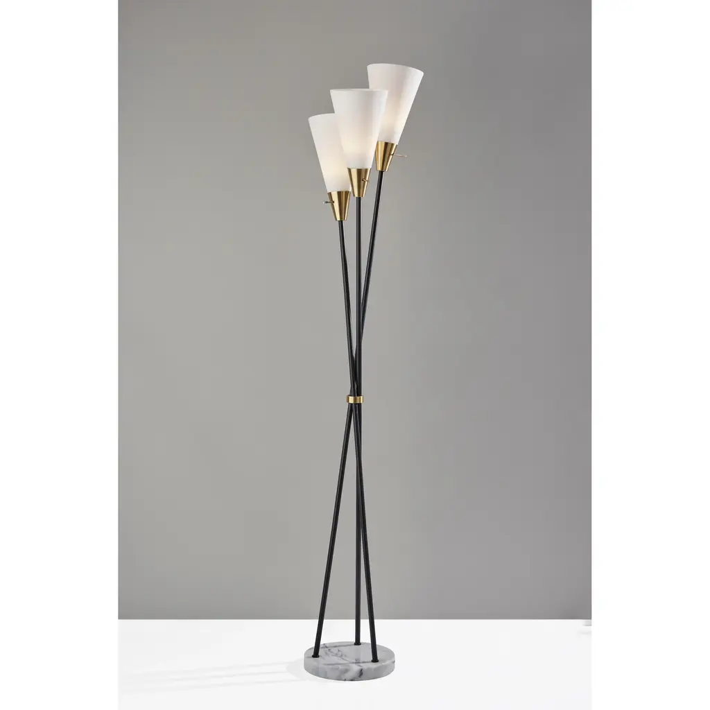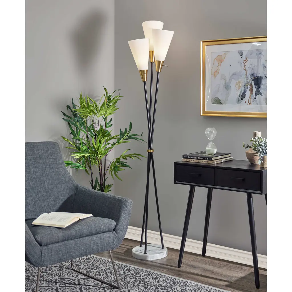 The Dixon 3-light torchiere floor lamp combines high quality materials to create a unique modern chic design. The 72″ tall and 15″ deep lamp makes for the perfect addition to bedrooms or living spaces. An 11″ round white marble base supports three long poles in a black metal finish, intersecting in the middle with an antique brass accent piece. Each pole is topped by a frosted glass cone-shaped shade with an antique brass base. Each 100W bulb (not included) is operated by a rotary switch located on the sockets. Complete your décor with the coordinating Dixon combo torchiere floor lamp. Features: Black and brass metals are mixed to create a striking, mid-century modern look. Three frosted glass cone shaped shades provide soft, ambient room filling light. An 11" round white marble base both elevates the look while also keeping the lamp sturdy on any surface. Operated by a rotary socket switch on each shade turning each light on and off. Additional Specs: Shade Dimensions: 6.75"TD x 2"BD x 9.75"H Shade Material: Frosted Glass Shade Shape: Cone Shade Fitter: Screw Down uno Tube Diameter: .625" Light Settings: On/Off Bulb Required: 3 x 100W Switch: Rotary Switch on each Socket Base Finish: White Marble Base Measurement: 11" Dia. Cord Length 60-inches