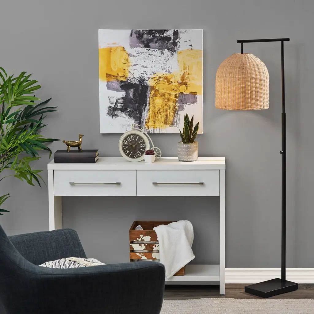 This floor lamp's woven rattan shade adds tropical ease to its streamlined silhouette. The rotary switch on the stem makes it easy to turn on and off.