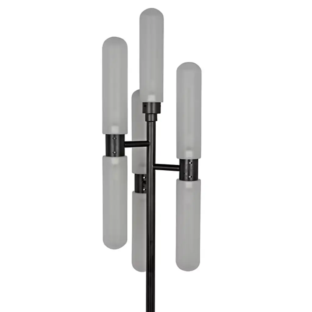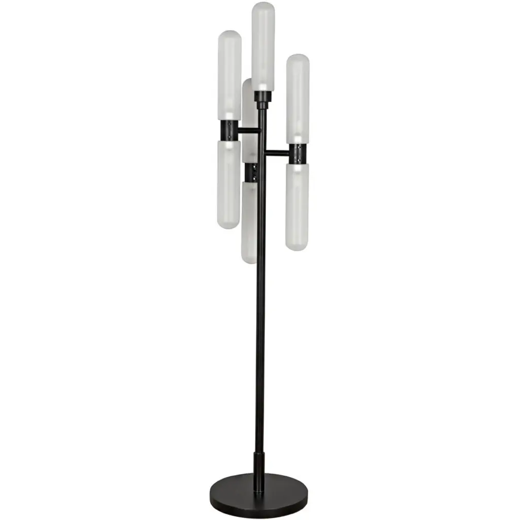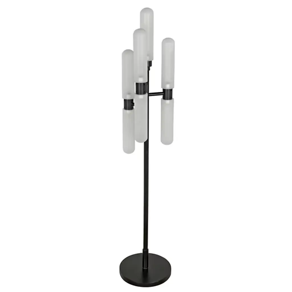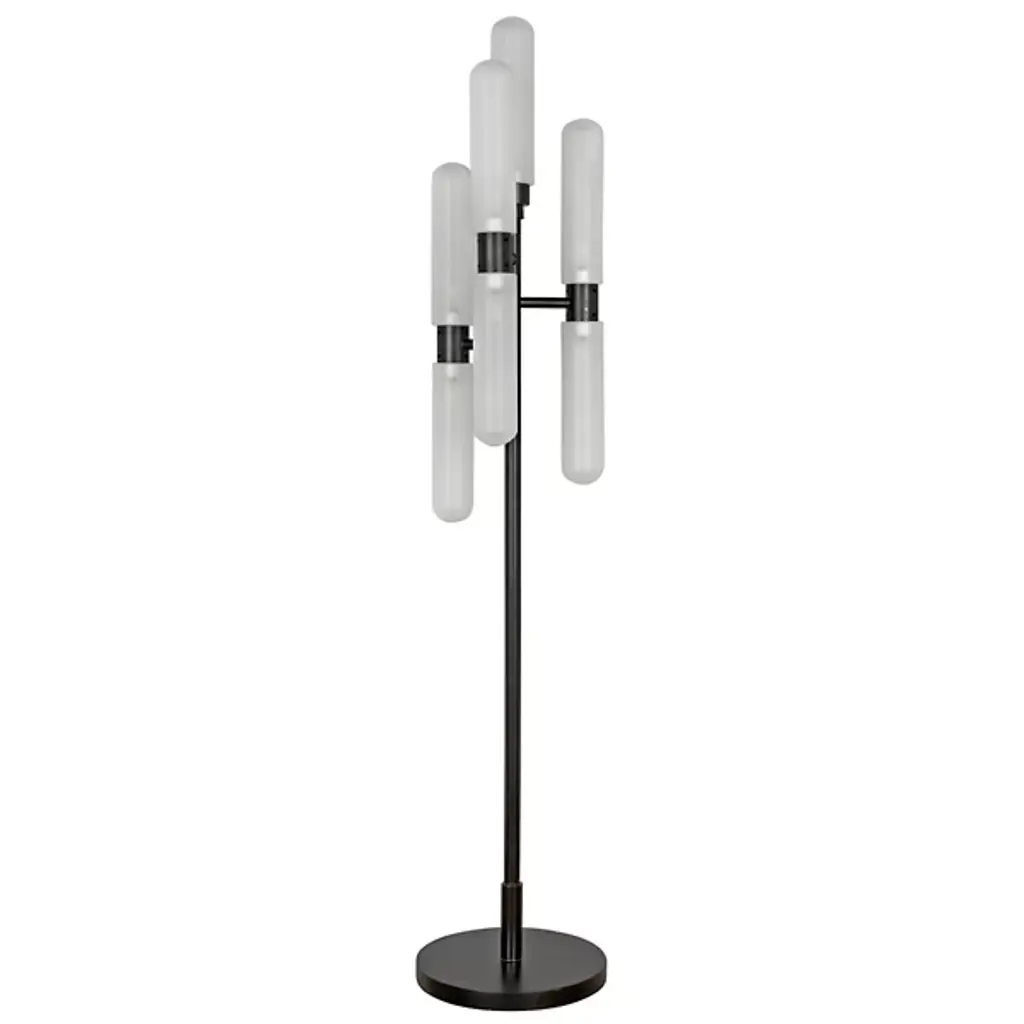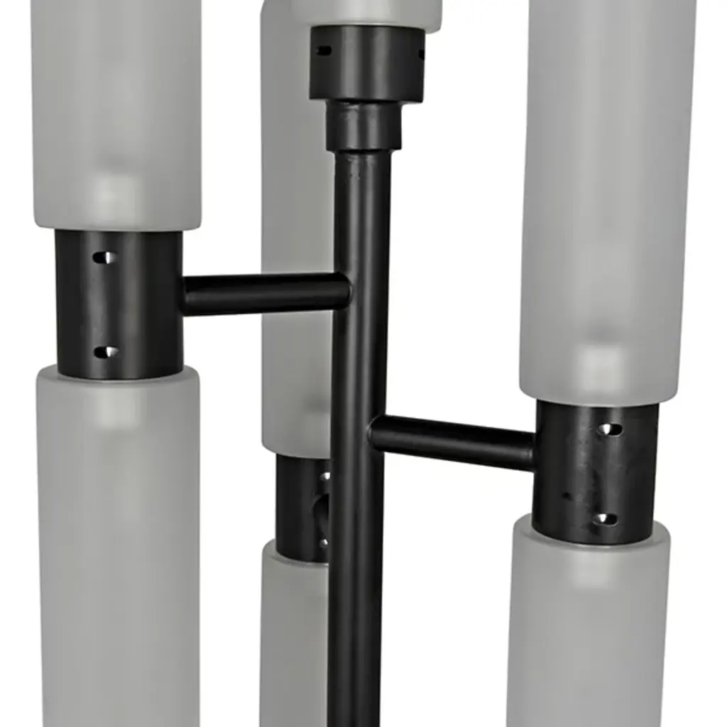 The Dominique Floor Lamp from Noir is an exquisite blend of strength and mid-century modern elegance. The robust industrial steel framework effortlessly supports frosted glass shades at the tops and bottoms of encasements stemming from discreet arms, creating a lovely contrast between durability and delicacy. This lamp stands as a testament to its impeccable craftsmanship and design. Stabilized by a sturdy baseplate, Dominique is a reliable lighting solution boasting the added convenience of a rocker inline switch.