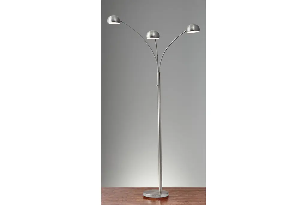 Make a bold style statement with the ultra contemporary and sleek Domino Arc Lamp. With an industrial chic satin steel finish, this gorgeous lamp can instantly transform your modern living room or office into the epitome of artistic elegance. Three poles and three lampshades can each be easily adjusted for light directly where you need it. The Domino Arc Lamp includes three 40 Watt high intensity bulbs for your added convenience.Shade: 5"diameter x 3"h