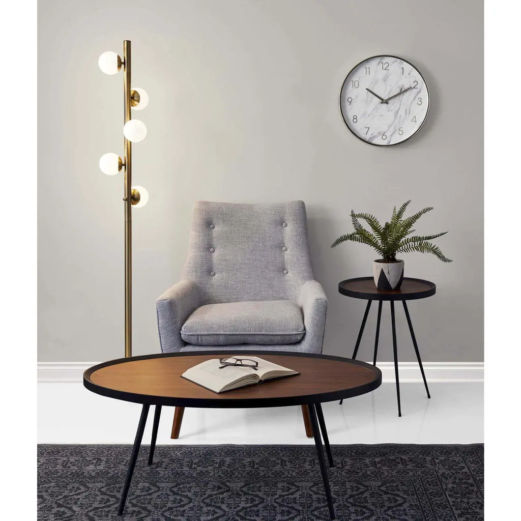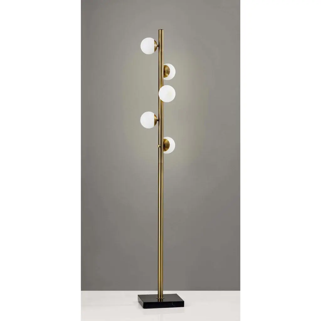 he Doppler LED Tree Lamp has mid-century modern inspiration. Five white opal glass globe shades are scattered along an antique brass pole. A square black marble base serves as a decorative accent as well as a heavy weight to keep this lamp sturdy and safe. This floor lamp ships with five G9 replaceable LED bulbs that give off a total of 1,000 lumens of warm, ambient lighting. The sleek look is finished off with a black fabric covered cord. Bulbs are included. This lamp is smart outler compatible.
