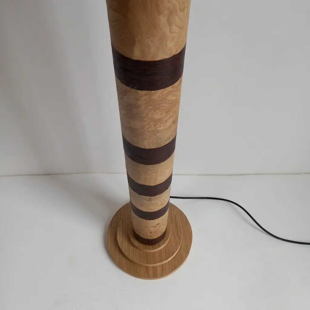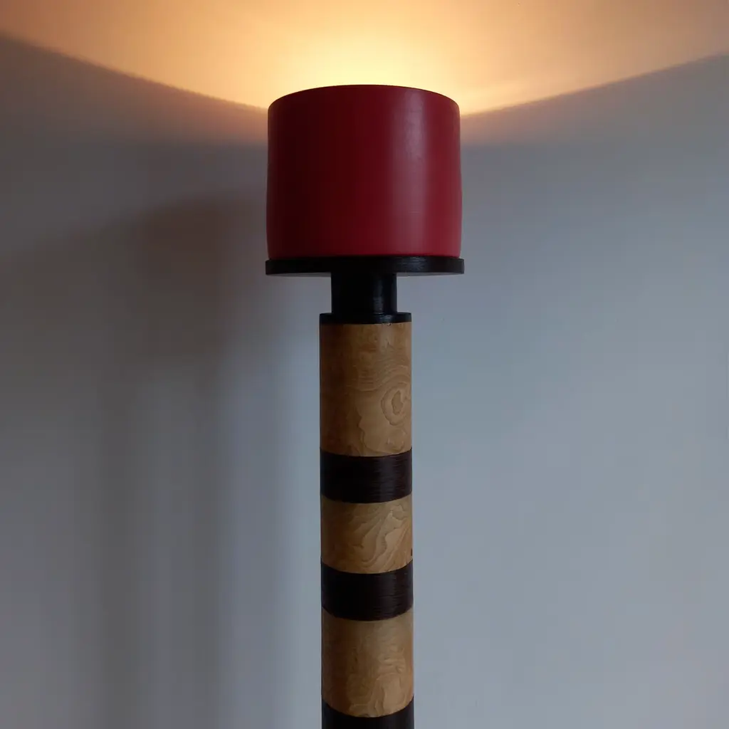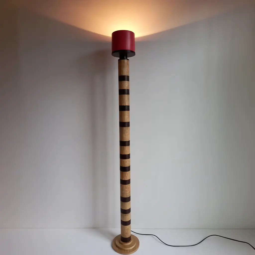 A clever interplay of minute manual inlays and rigorous geometric volumes characterizes this floor lamp as a design of exceptional decorative impact. Stemming from a tiered base, the bold cylindrical body strikes with its striped pattern guiding the eye towards the likewise cylindrical shade crafted of red-glazed bisque ceramic. Combining durmast, ash briar, and wenge, it also comes in different versions available in the Artemest catalog.