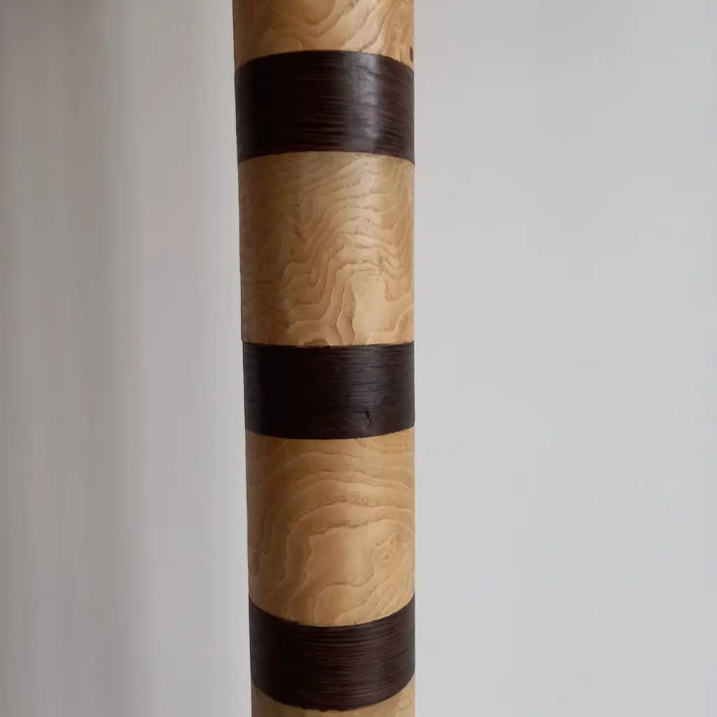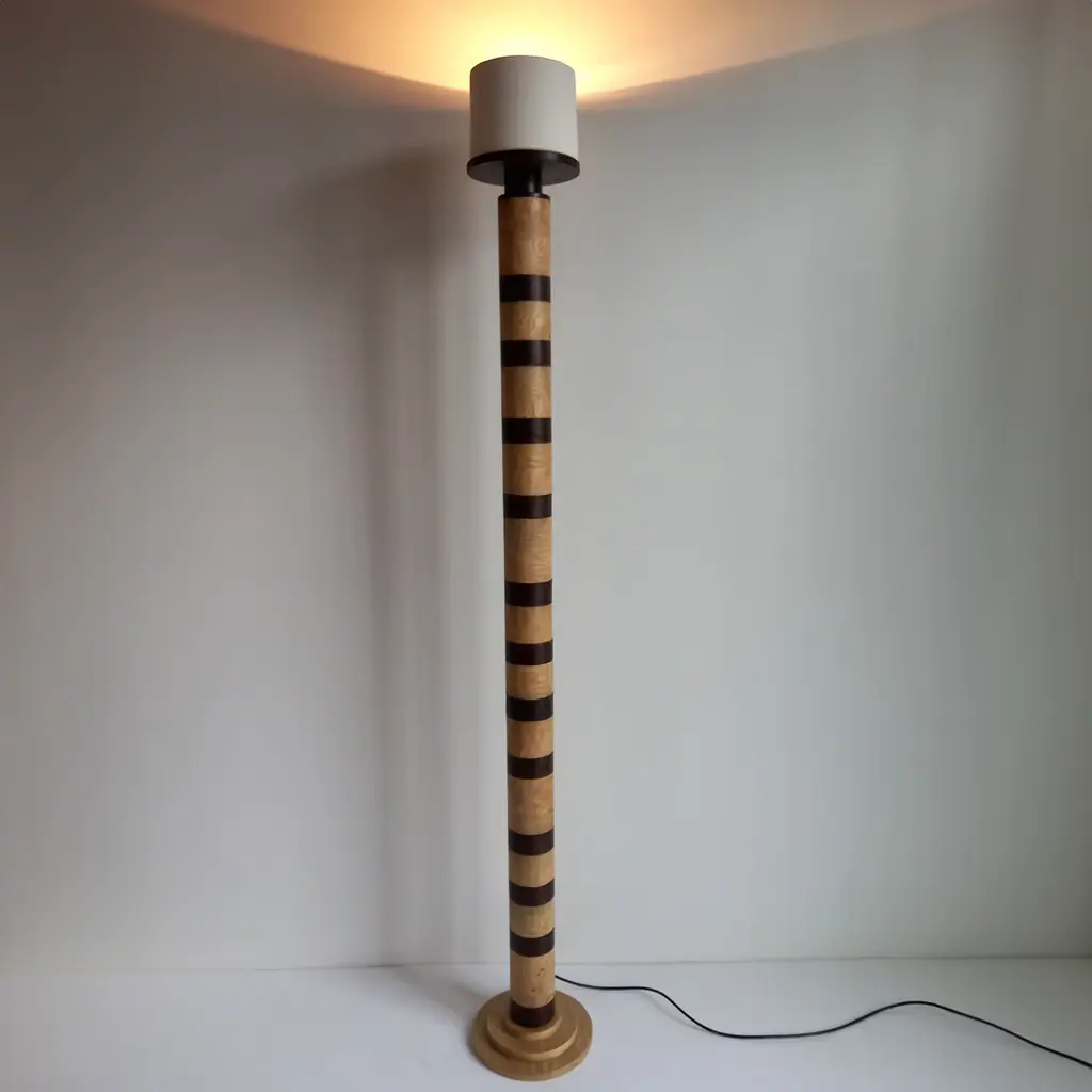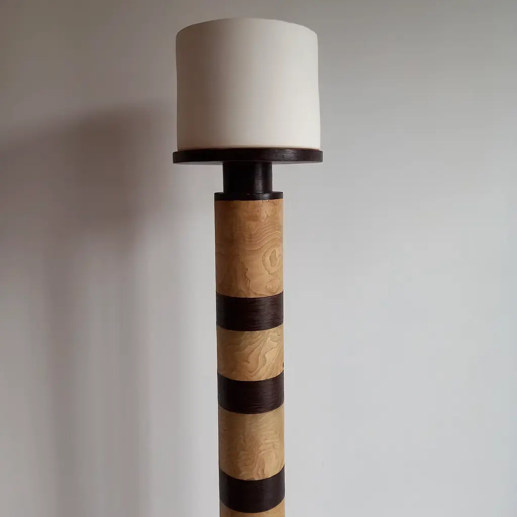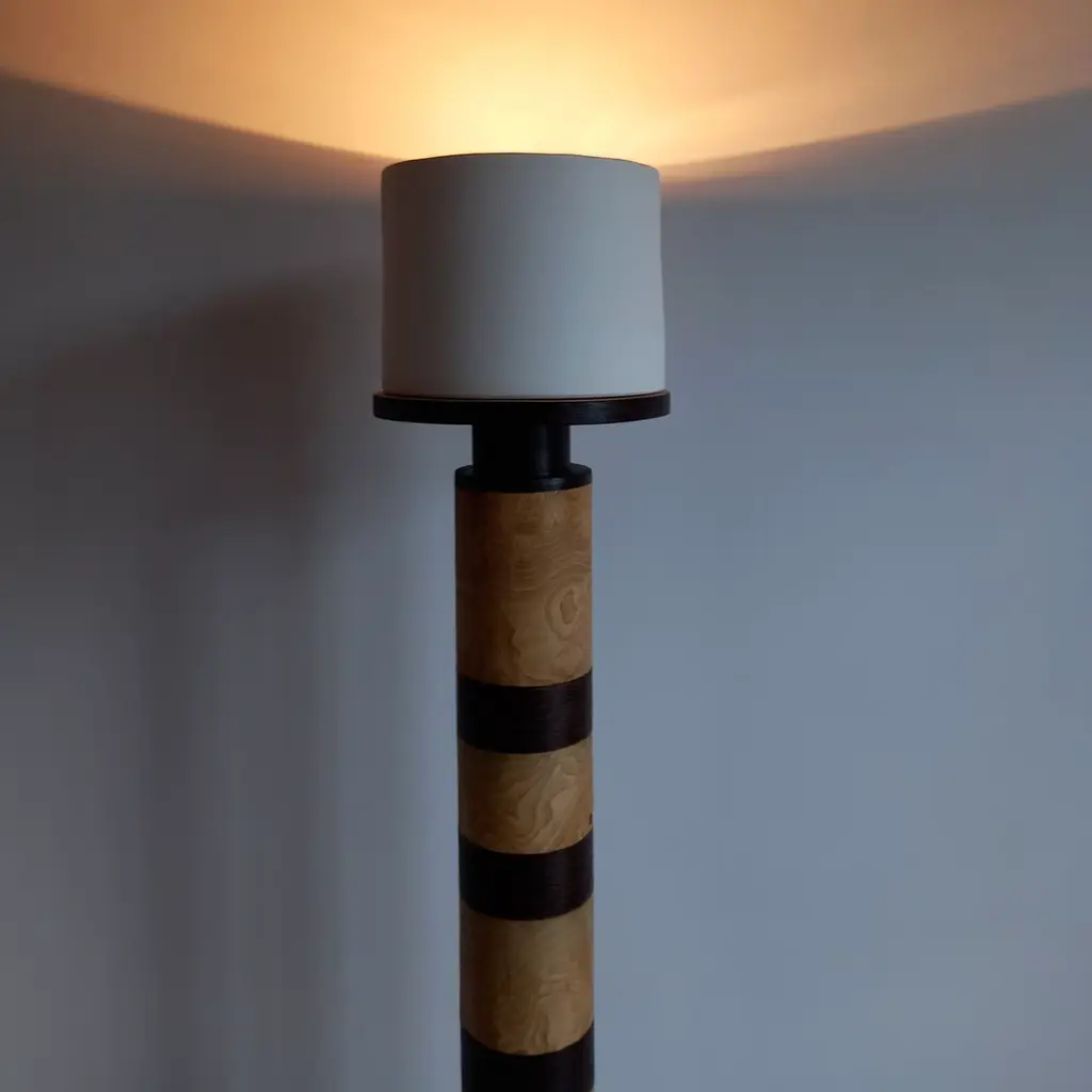 Masterfully turned and inlaid by hand, this floor lamp sports a boldly linear silhouette obtained with the assembly of cylindrical volumes. A white-glazed bisque diffuser tops the cylindrical structure, where durmast, ash briar, and wedge are combined to achieve a hypnotizing striped look. Designed by Pietro Meccani, it is available in different versions to be explored in the Artemest catalog.