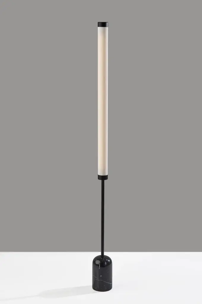 The Dorsey floor lamp combines a rich mix of materials, rounded contemporary design, and LED energy efficiency for the perfect accent lighting for your space. The 54.5" tall and slim 4.25" diameter lamp features a domed base in black marble. A black pole supports a cylindrical white textured cotton shade. Both economical and versatile, the integrated 24W eco-friendly LED produces up to 1,200 lumens to brighten your space. Operated by a touch switch conveniently located on the top of the light shade, the lamp projects light with three brightness settings and three color temperature settings all controlled by the touch of a finger. The lamp is also powered by a 5'' black cord. Complete your décor with the Dorsey LED table lamp.At 54.5" tall and a mere 4.25" in diameter, the lamp is the perfect addition to room corners or beside furniture.A smart touch switch controls three color temperature settings: 2700K, 4000K, and 5000K.Three brightness settings are controlled with the touch switch.Integrated LED lighting is energy efficient.The black marble base creates a polished look while providing sturdy support to the lamp.24W LED