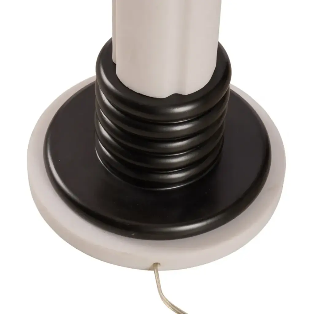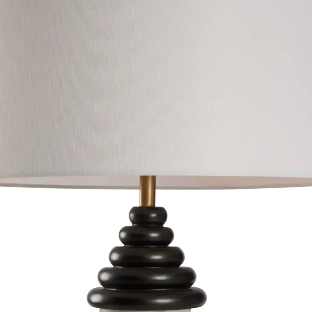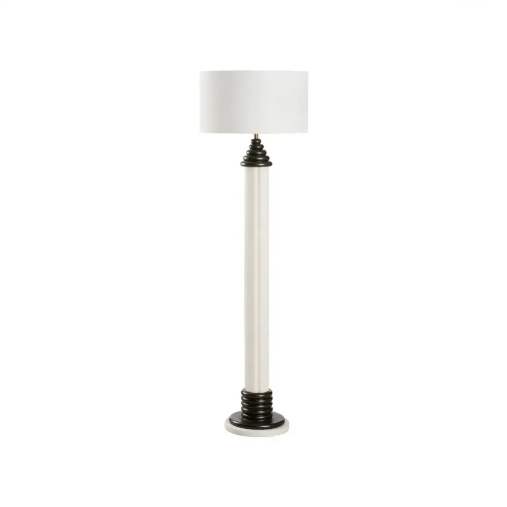 The Dorton Floor Lamp features a sculpted resin base with stacked detailing in contrasting finishes. Sleek and modern, it brings architectural interest and warm illumination to any space.