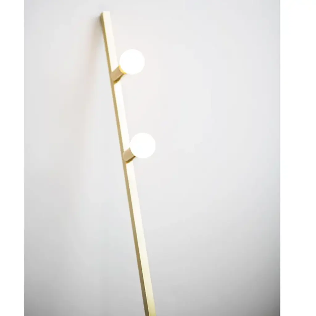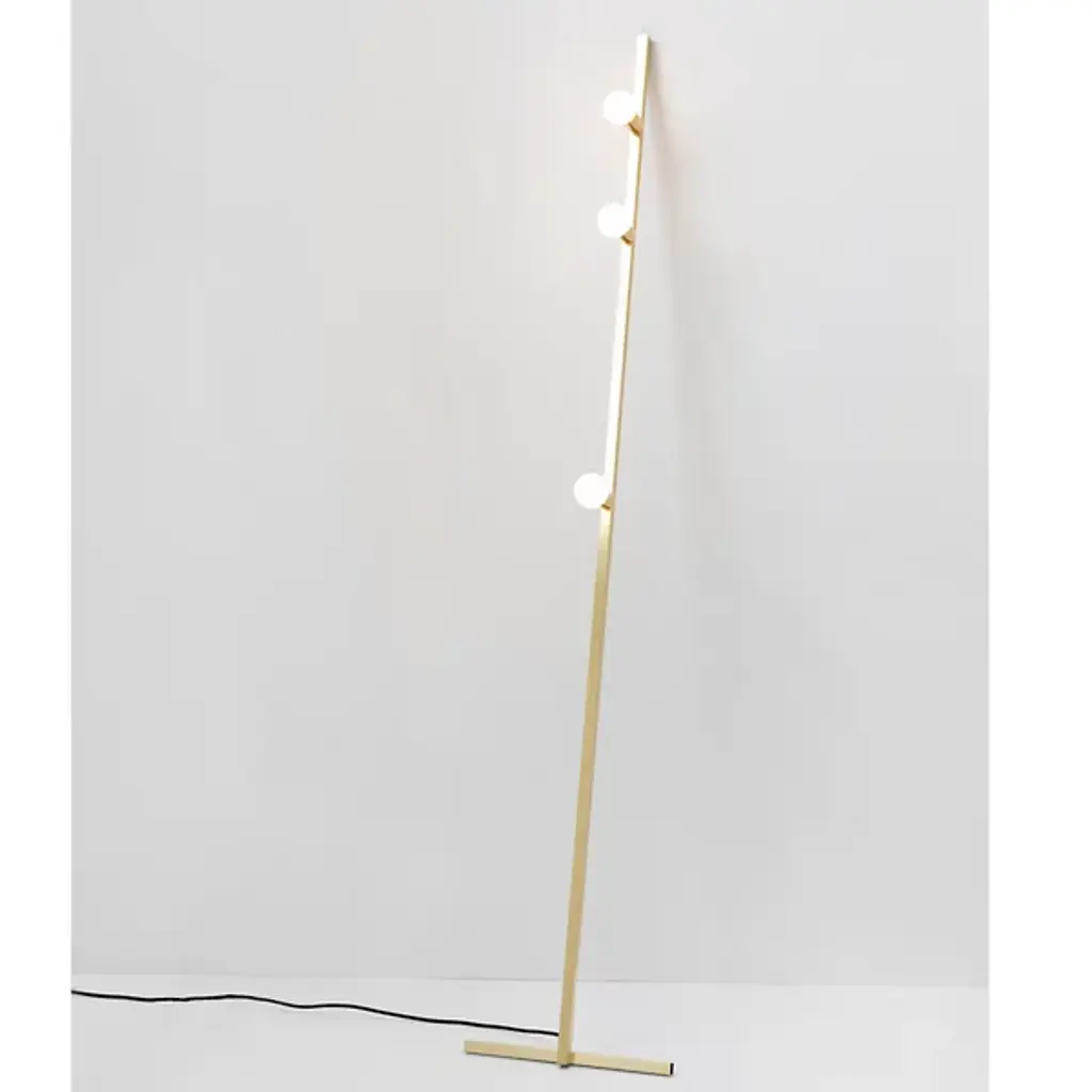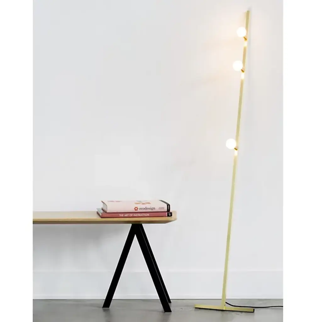 A simple and clean modern piece, the Dot Line Floor Lamp from Lambert & Fils shapes the décor of your home with a minimalist form. Made of smooth metal throughout, this piece starts with a brief horizontal base that extends a lengthy vertical rod that forms a T-shaped silhouette. Along the body rests a set of three bulbs, each spreading a bright and full glow that evenly spreads as a welcoming layer of light.
