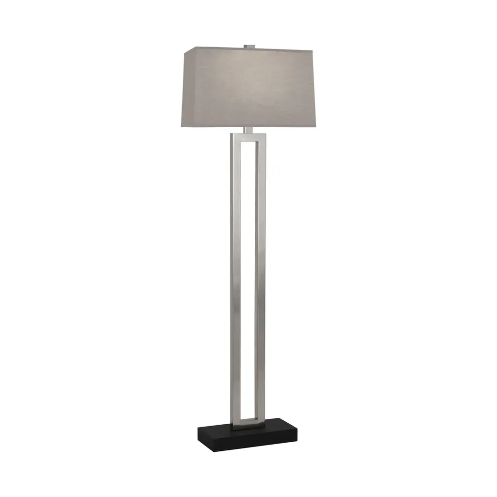 Doughnut Contemporary Floor LampFeaturesNumber of bulb: 1Bulb type: AMax wattage: 150WVoltage: 120VSocket: Medium E26Switch: 3-WaySwitch location: SocketFinish: Antique SilverShade: Rectangular Snowflake Fabric ShadeCord color: SilverUL listed: DryDimensionsShade dimensions: 8 inches top x 9 inches bottom x 11 inches down sideBase dimensions: 2 inches height x 14 inches width x 6.75 inches depth
