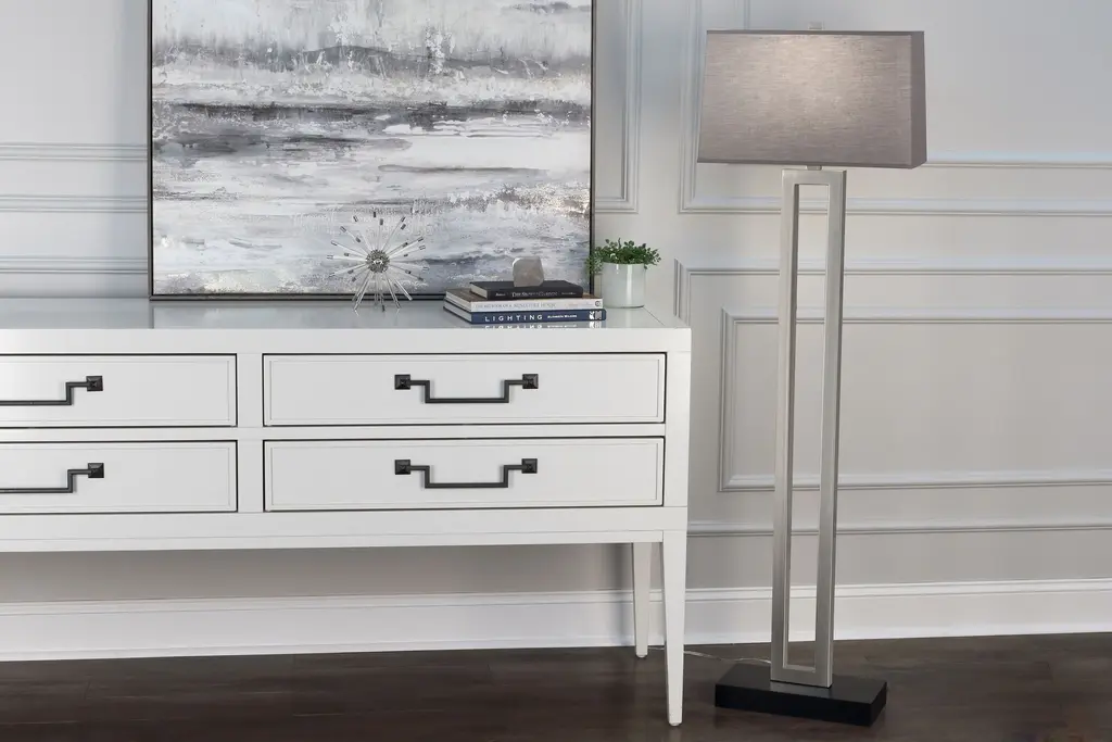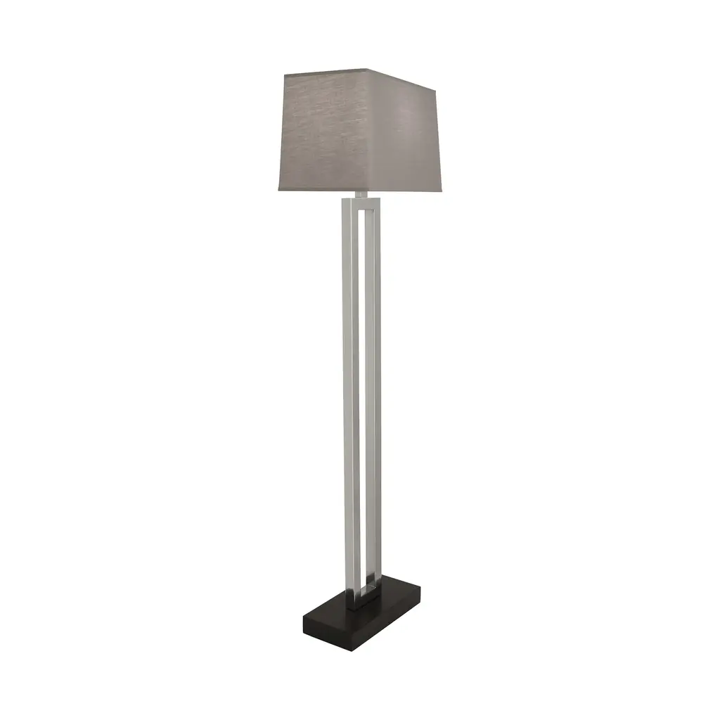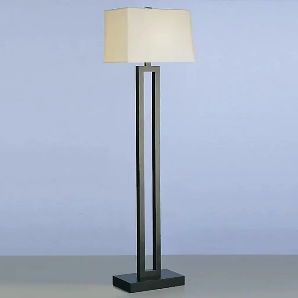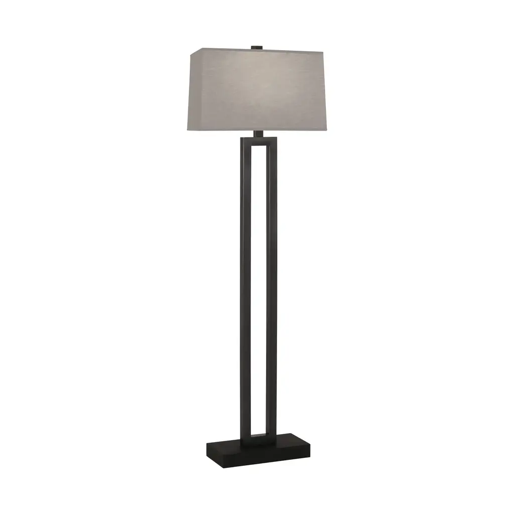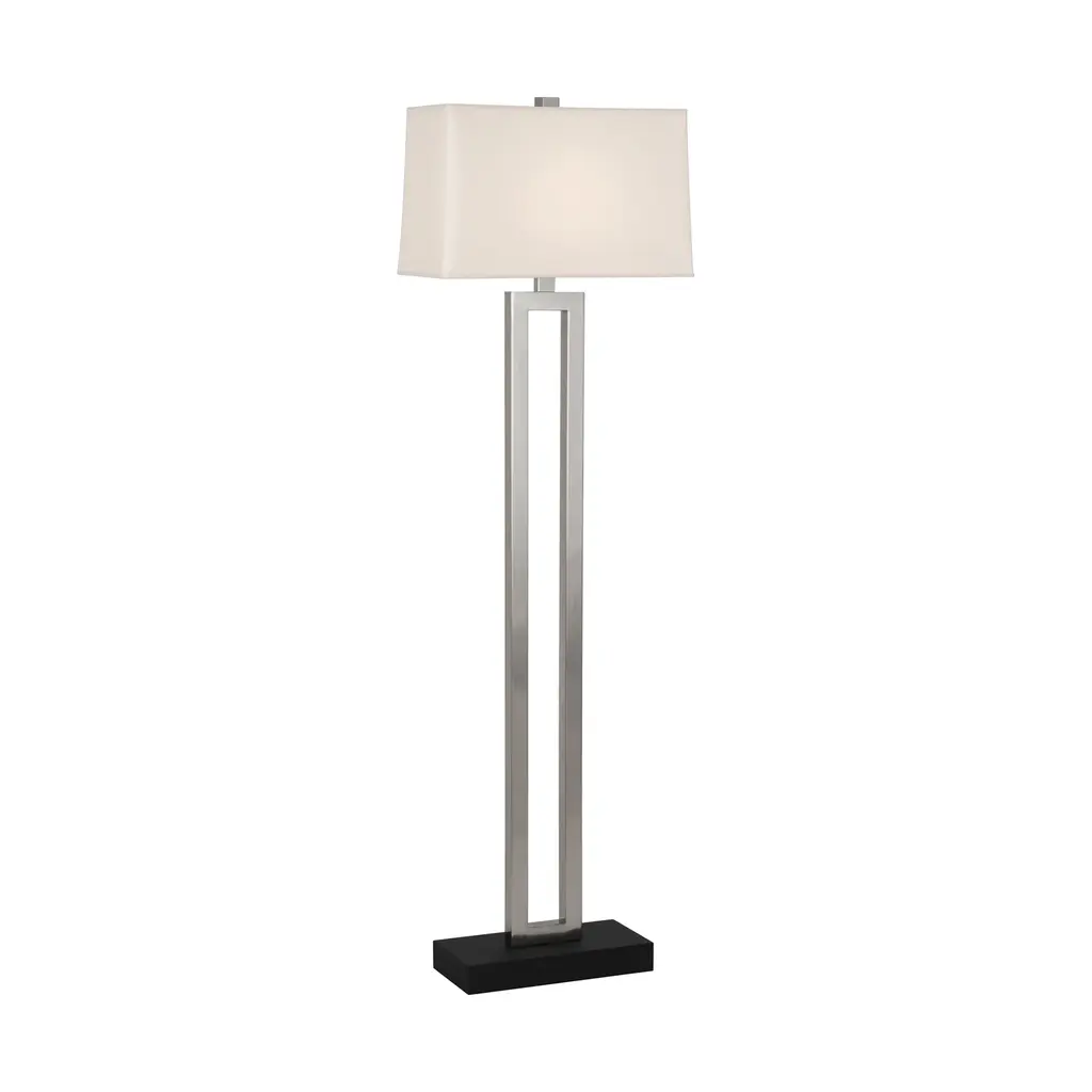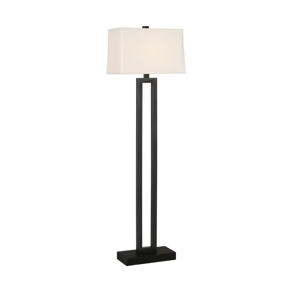 The Doughnut Floor Lamp from Robert Abbey combines minimalist design with elegant form. Its hollow rectangular shape, reminiscent of a long doughnut, is crafted from metal and finished with an ebony wood base for a refined look. The Rectangular Snowflake fabric shade softens the light, while the three-way switch offers versatile illumination to suit any mood or setting. A sophisticated addition that blends style and function seamlessly. Highlights