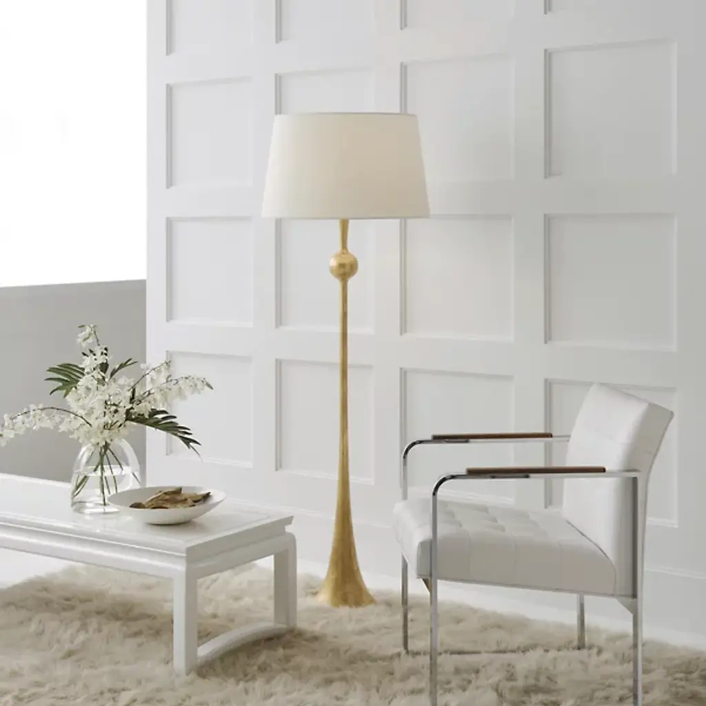 Quiet yet unmissable. The Dover Floor Lamp from Visual Comfort Signature, formerly known as Visual Comfort, is a formal affair for the modern home, dressed in curves and warm light. Through its slender figure, the floor lamp slots alongside a sofa or in between the corners of the room. Its connected steel body and base impress with long, sweeping curves. These curves act like an arrow as they lead one’s eyes to the intriguing globe accent and classic shade on top. The tapered drum shade surrounds the lamping for minimal glare. The piece turns on to generate a grand vertical glow and a mellowing ambient light.