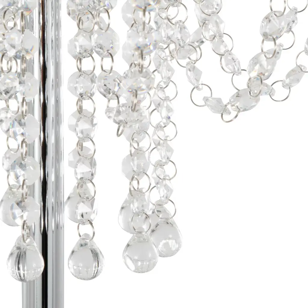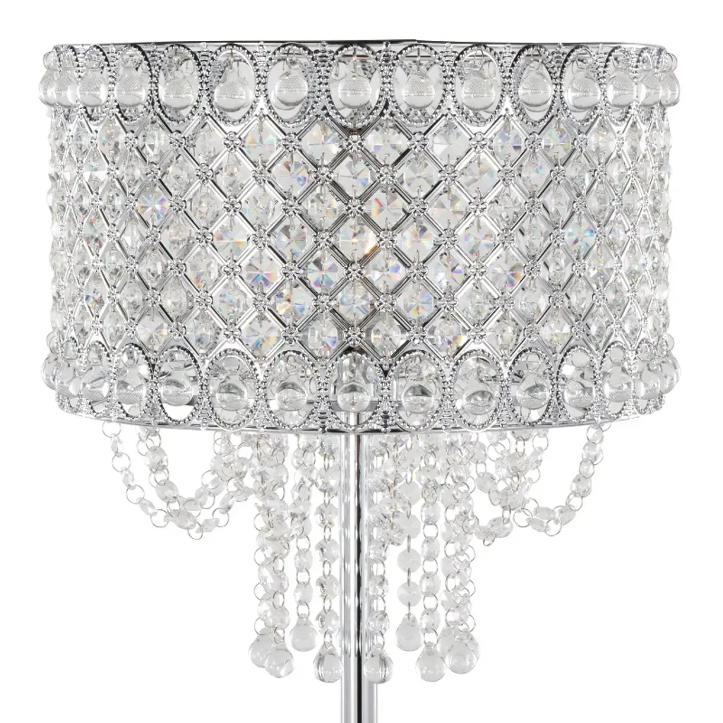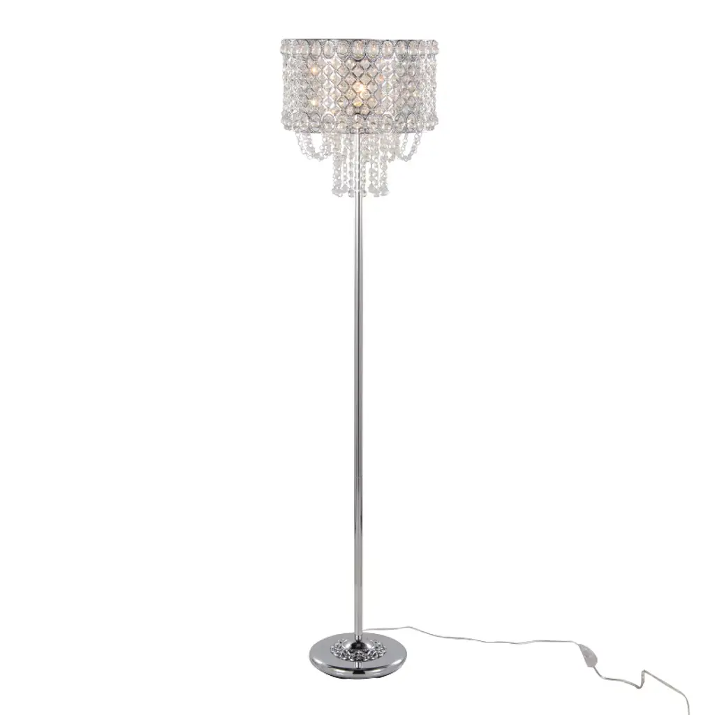 Add glamour and glitz to your life with the Droplets Floor Lamp from Grandview Gallery by LumiSource. A chic addition to modern aesthetics, it showcases a gorgeous metal shade with crystals that have been individually threaded into the shade and crystal beads that hang off the bottom. When lit, all of the genuine crystals cast a radiant display of cascading patterns onto surrounding walls.Contemporary stylingCrystal and metal shadePolished chrome finish