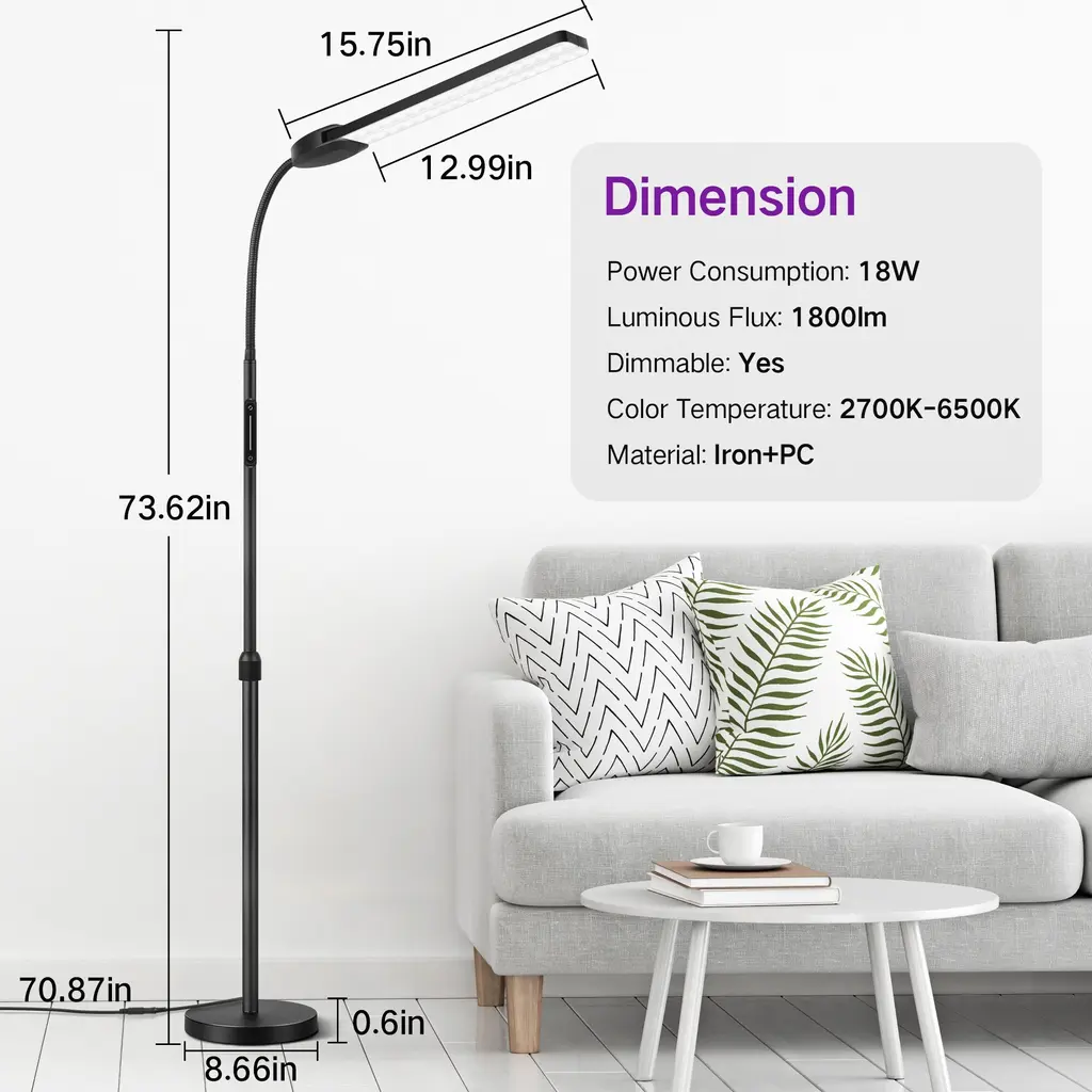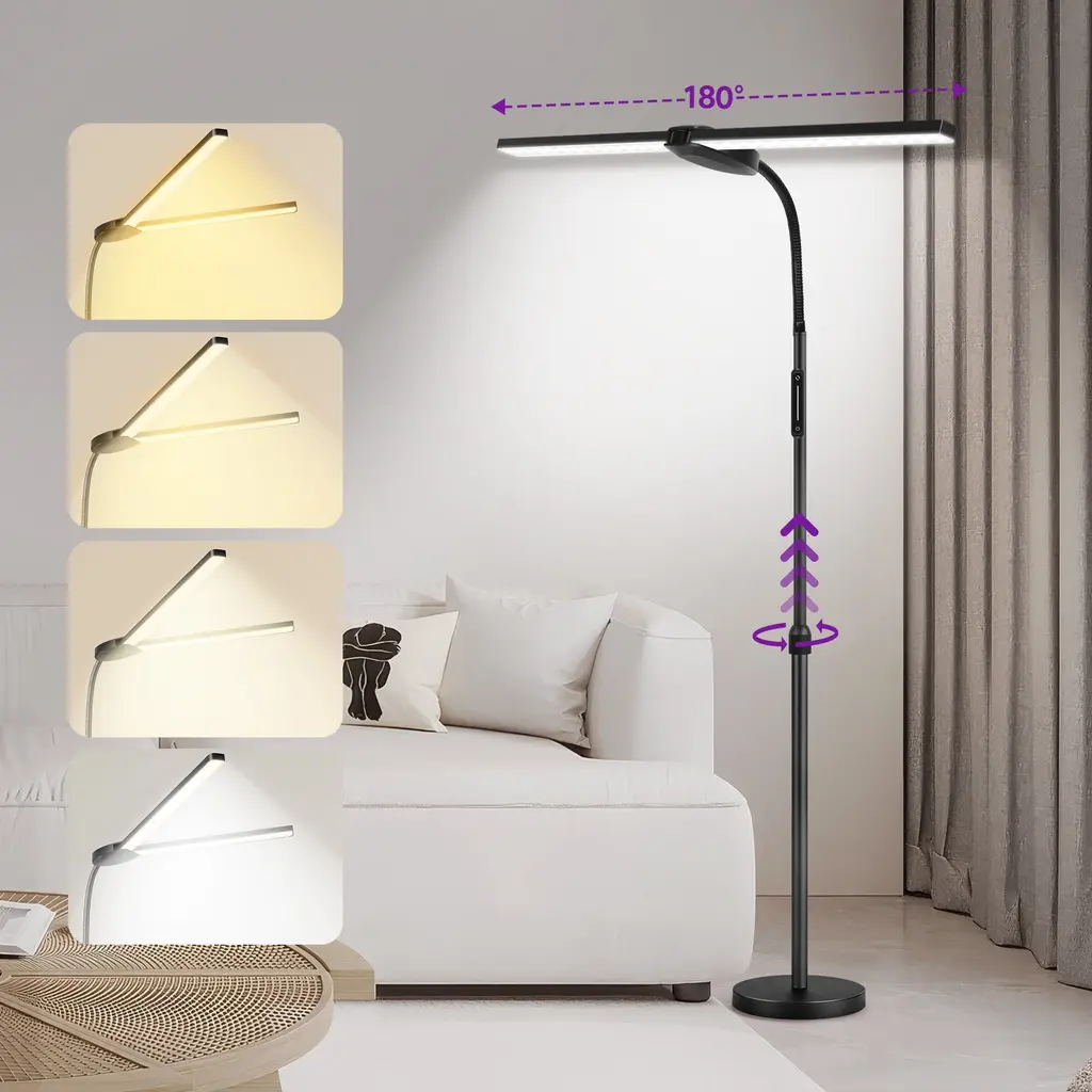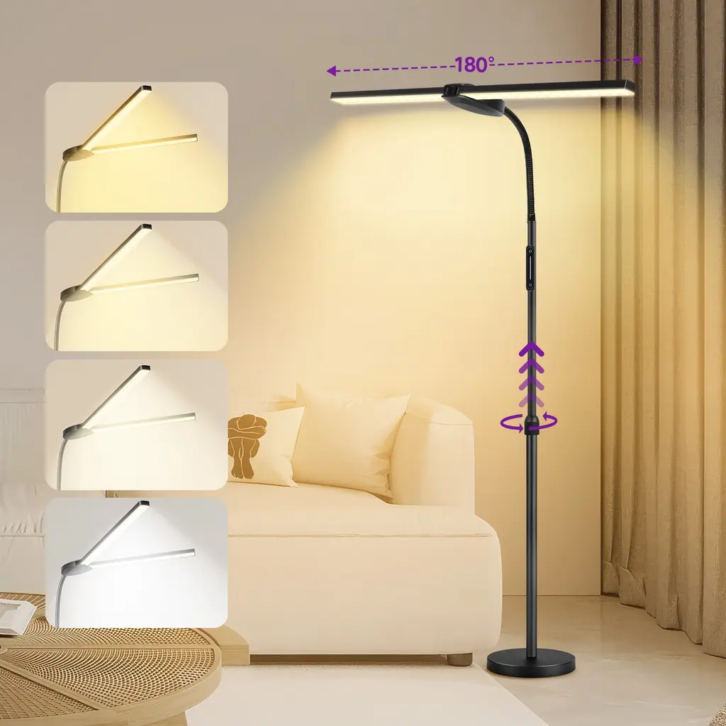 Enhance your living space with our 68.5" dual-head sofa lamp, featuring remote and touch slider controls. Choose from four specific color temperatures (2700K, 4000K, 5000K, 6500K) ranging from warm to cool light, and enjoy adjustable brightness for customized lighting. With adjustable height and a weighted base for stability, this lamp also includes a power-off memory function for added convenience. Feature :