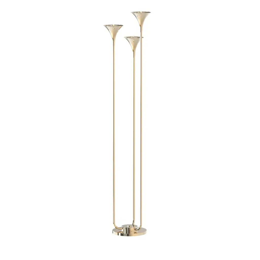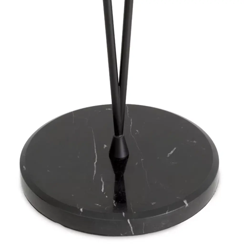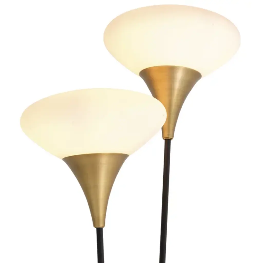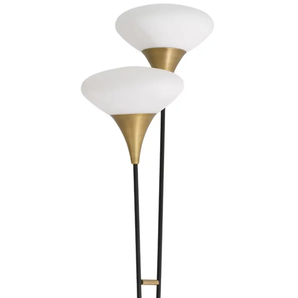 The Duco Floor Lamp is an attractive mid-century modern design from Eichholtz. Two sloping stems grow up and out from the circular base below. At the top of each is a mushroom-shaped glass shade nestled in antique brass. Soft light diffuses through the glass for a pleasant glow of illumination. A flourish in between the stems adds visual interest. It’s a transitional composition of lighting that will elevate a space with sophisticated style.