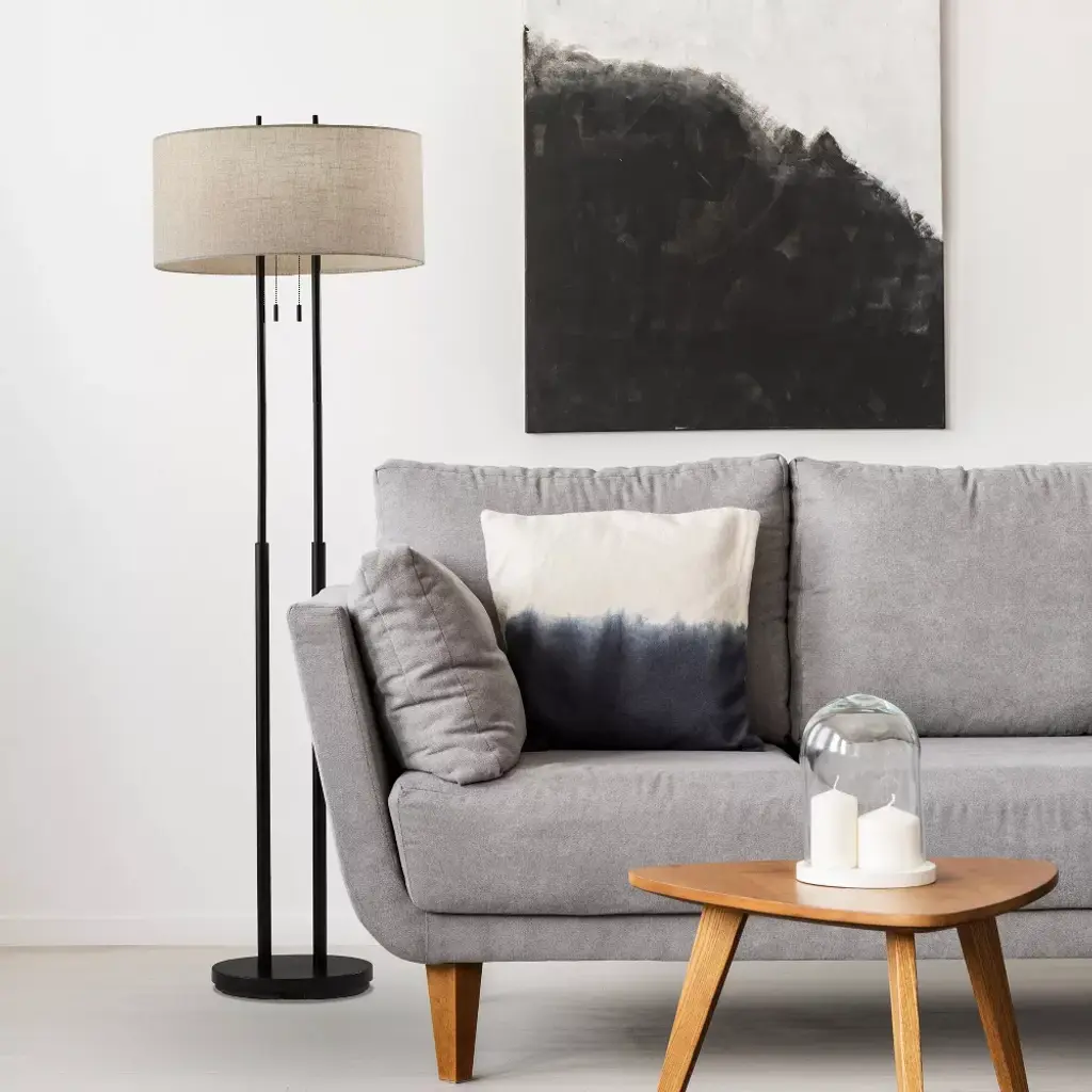 A classic pairing of bronze finishes and taupe textured fabric makes the Duet floor lamp a perfect match for a modern farmhouse styled bedroom or living space. Two bronze poles each hold a socket, offering double the light, each operated by its own simple pull chain switch. The bronze finished finials create the illusion of continuous poles. Turn one light on for soft, mood-setting lighting or turn both on for a room-filling glow. Bulbs are not included.